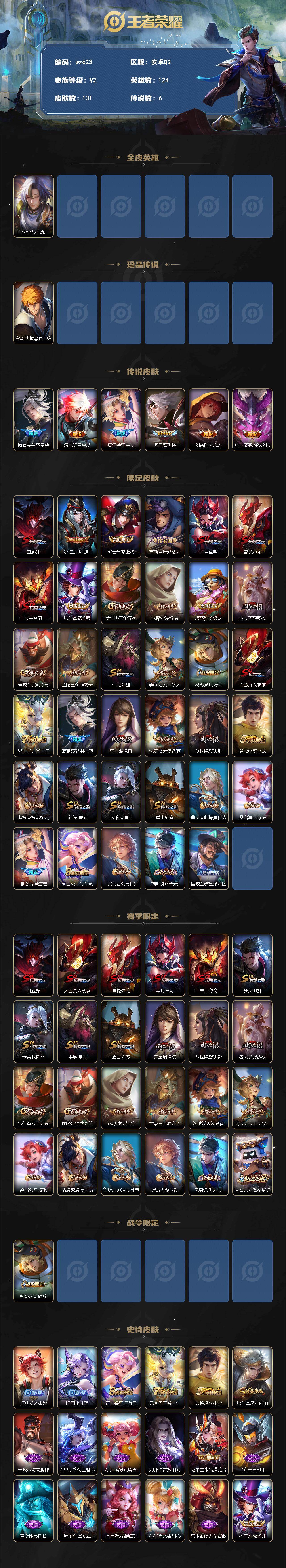 7075/安卓Q-V2-荣耀黄金II段位-124英雄-131皮肤-1珍品传说-6传说-20史诗