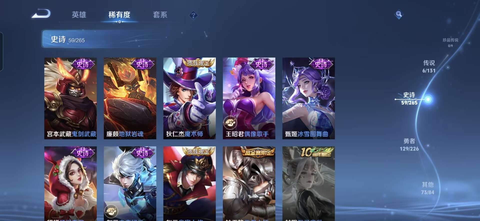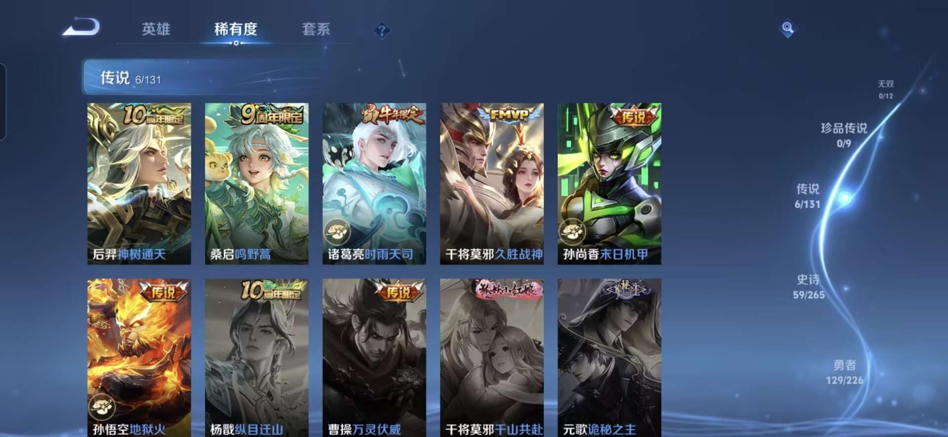 【史诗皮肤】 天狼溯光者 冰锋战神 默契交锋 灵蛊蚀心 踏浪烽翎 夏日便利店 江河有灵 幻夜行动 决胜大满贯 百相守梦 顽岩魄 巫礼祀神 光弋星穹 魅语 繁