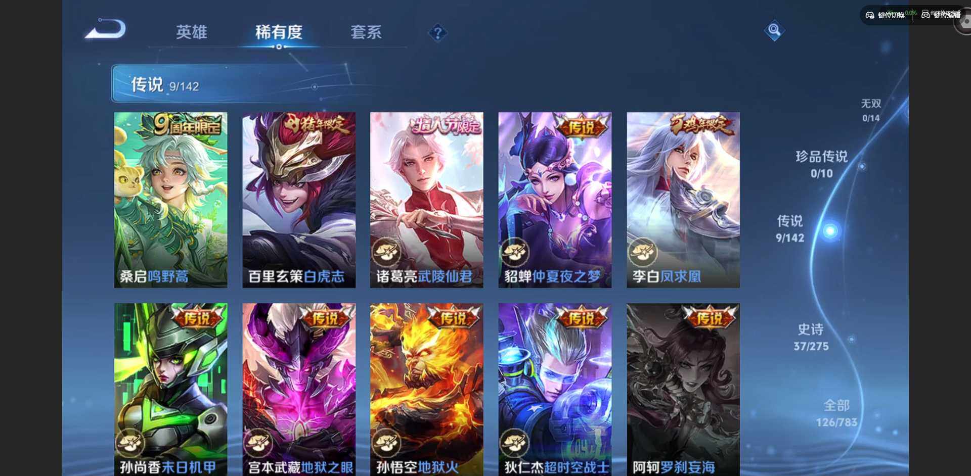 实名: 可修改 贵族等级: V7 英雄数: 118 皮肤数: 126 传说皮: