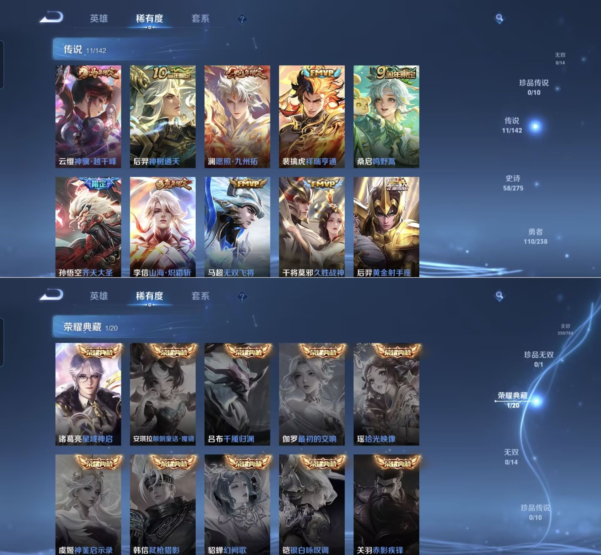 【传说皮肤】 神树通天 鸣野蒿 神骥·越千峰 祥瑞亨通 愿照·九州拓 齐天大圣 山海·炽霜斩 无双飞将 久胜战神 地狱之眼 黄金射手座 【史诗皮肤】 茶境仙 星君·亢金 飞衡 器灵·浮梦炉 玫瑰异探 布丁狗之约 谧流熔炉 电玩小子 涂山容容