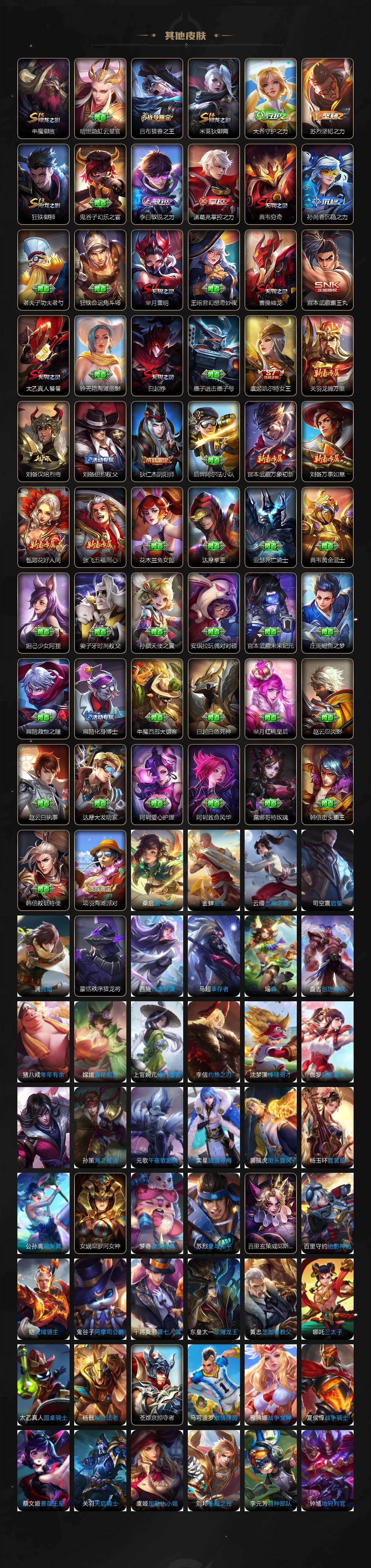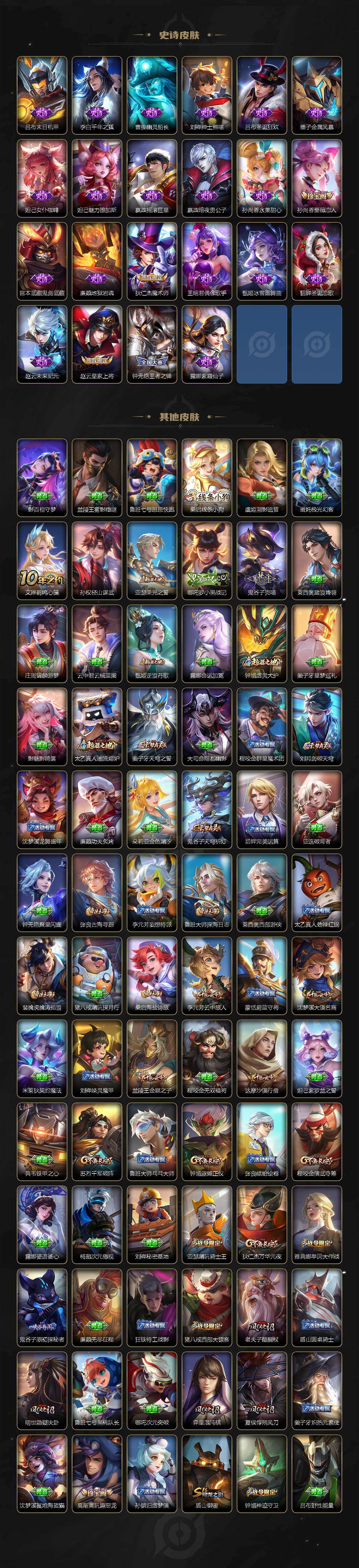 【限定皮肤】:白起狰,姜子牙天穹之誓,狄仁杰阴阳师,虞姬凯尔特女王,赵云皇家上将,妲己时之彼端,嬴政白昼王子,孙尚香蔷薇恋人,鲁班