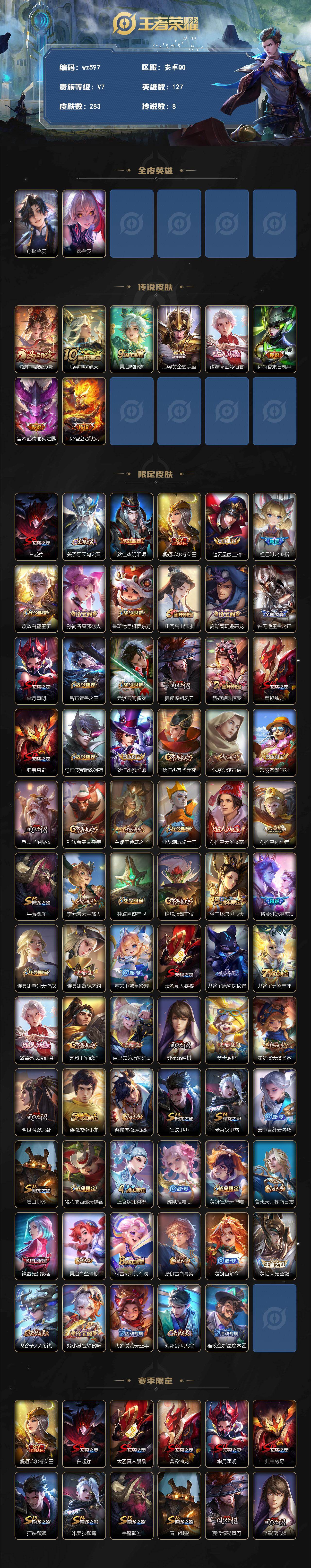 487016/安卓Q-V7-最强王者段位-127英雄-283皮肤-8传说-81史诗