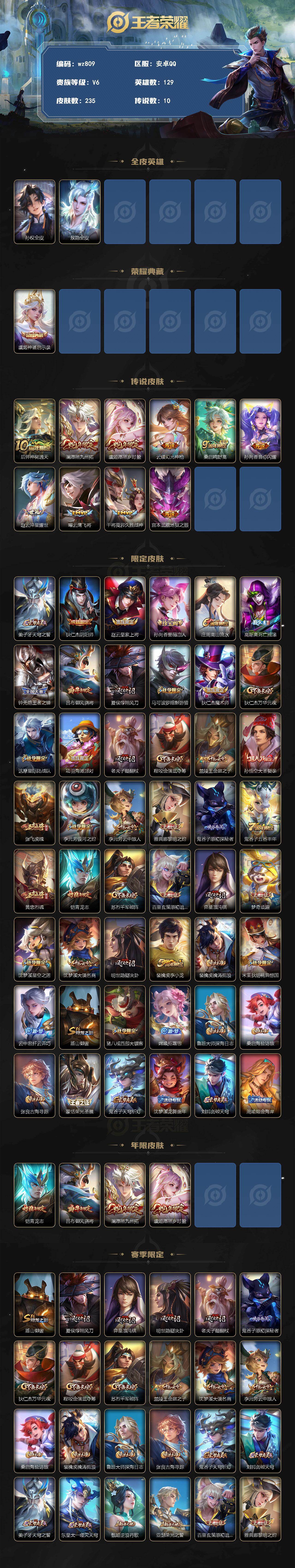 安卓Q-V6-永恒钻石II段位-129英雄-235皮肤-1典藏皮肤-10传说-