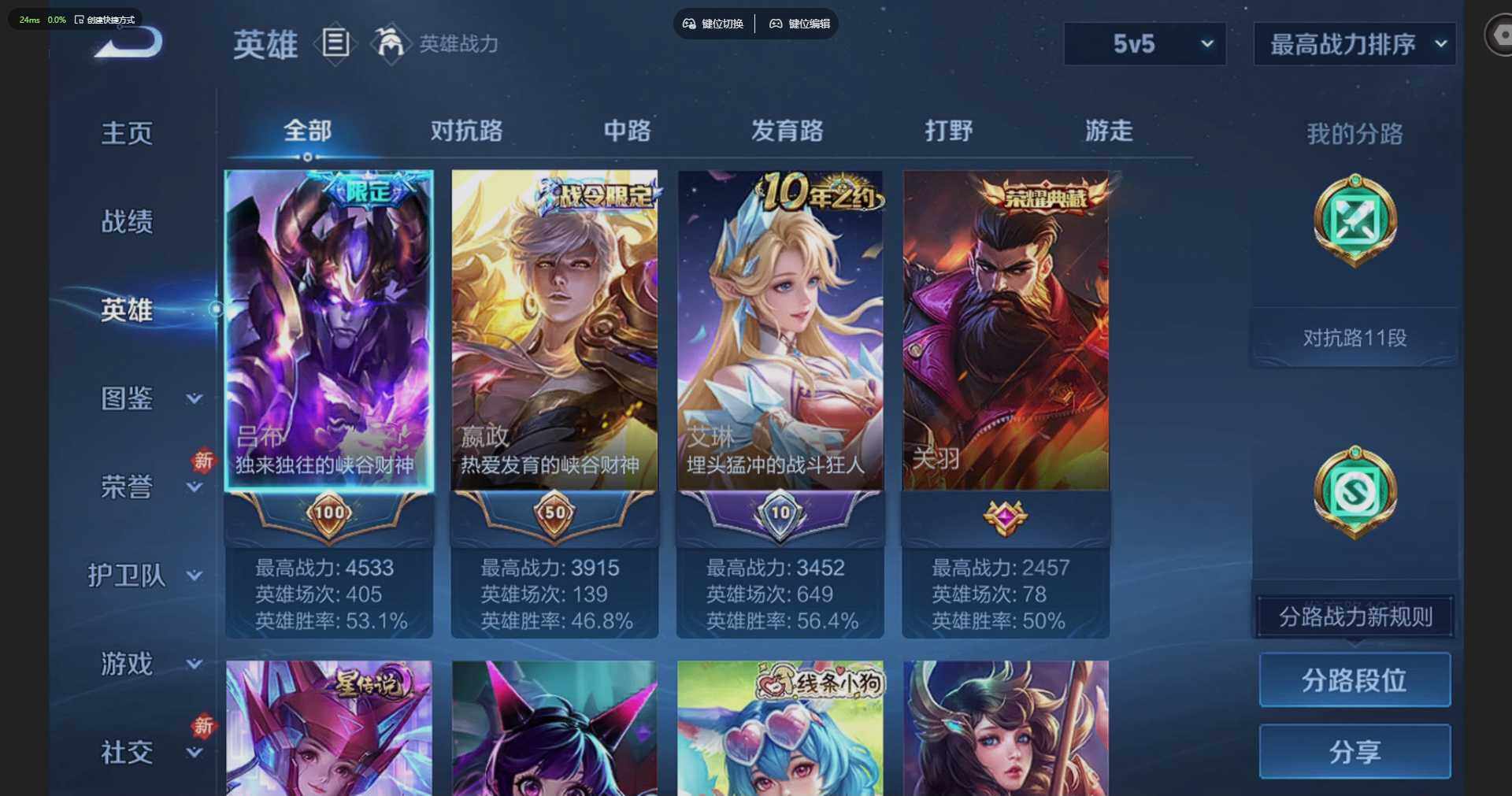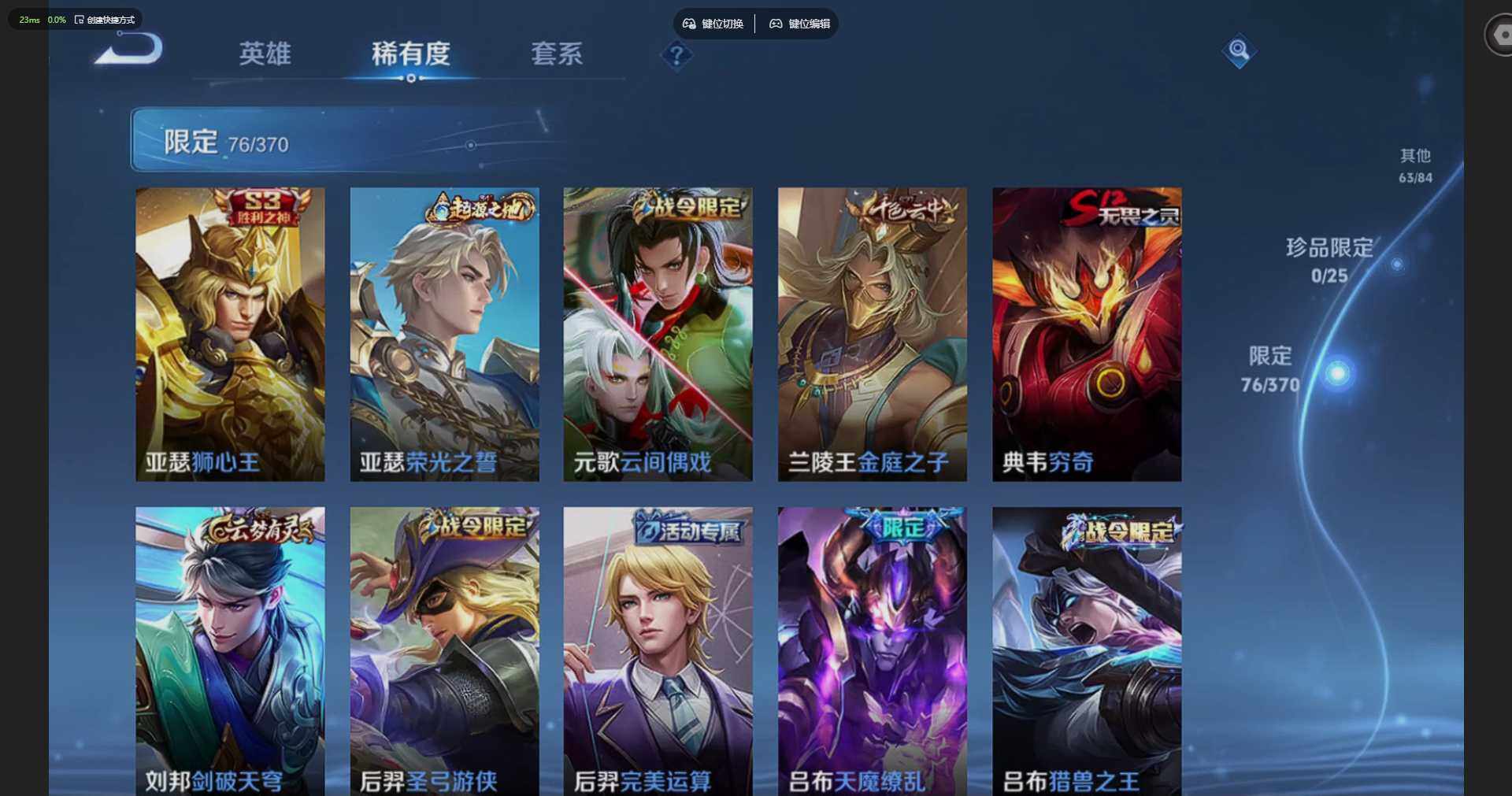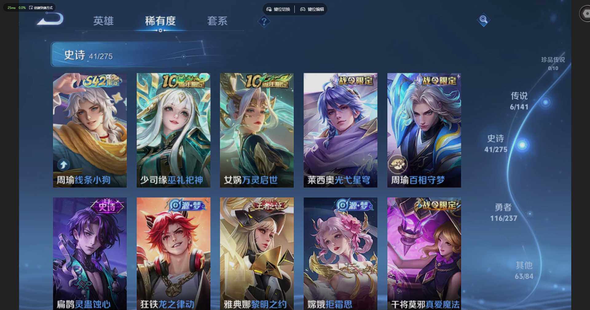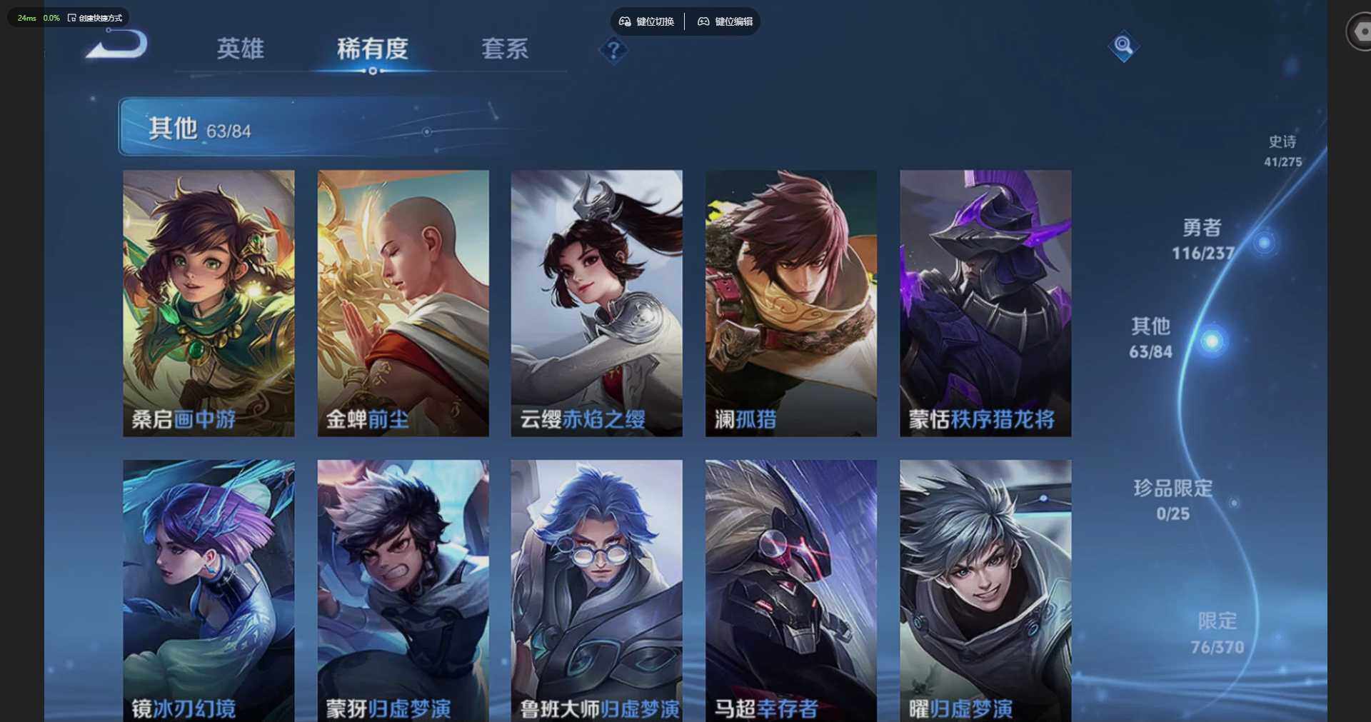 实名: 可修改 贵族等级: V7 英雄数: 127 皮肤数: 227 荣耀水晶