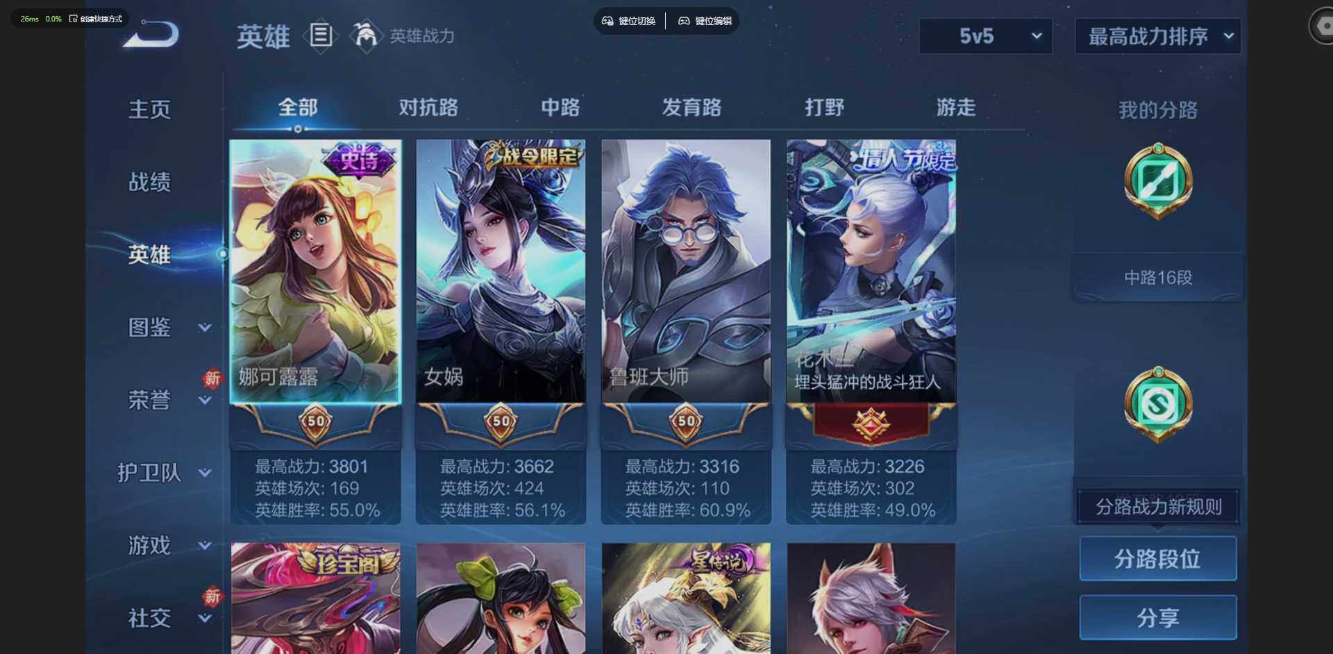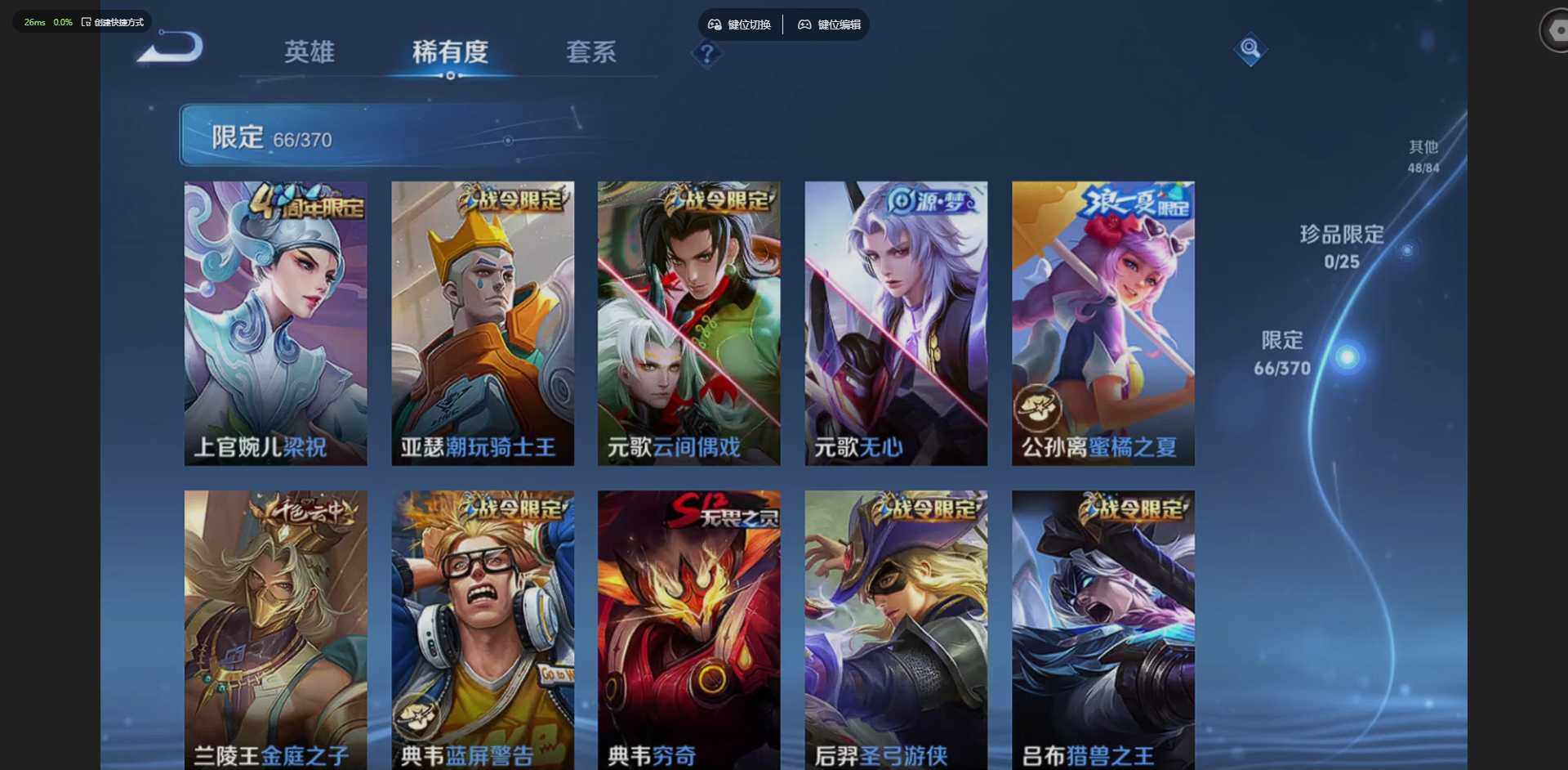 实名: 可修改 贵族等级: V7 英雄数: 127 皮肤数: 205 荣耀水晶