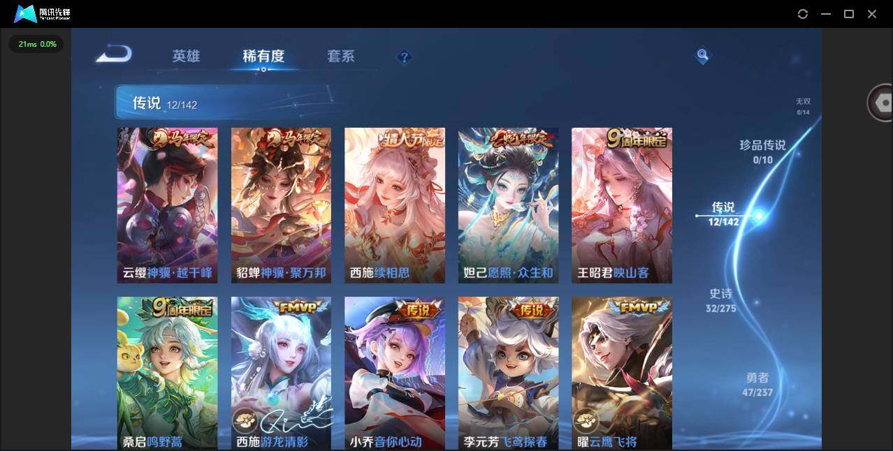 实名: 可修改 贵族等级: V7 英雄数: 125 皮肤数: 111 星传说: 金色仲夏夜 传说皮: 云鹰飞将,久胜战神,仲夏夜之梦,音你心动-小乔,飞鸢探春,游龙清影,续相思,神骥·越千峰,神骥·聚万邦 限定皮: 游园惊梦,一生所爱,山海·碧波行,鸣野蒿,映山客,愿照·众生和