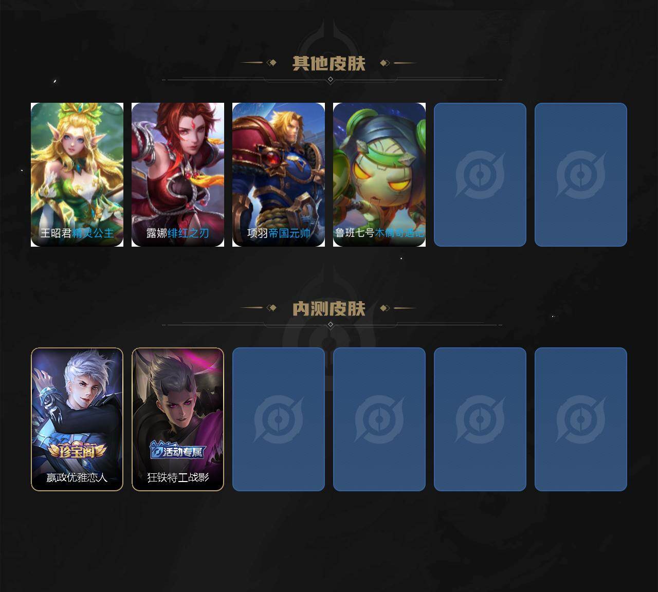 【传说皮肤】:马超神骥逐星野,后羿神树通天,澜愿照九州拓,桑启鸣野蒿,澜逐花归海,马可波罗妄想实况,李白诗剑行,马超无双飞将,宫本武藏地狱之眼,孙悟