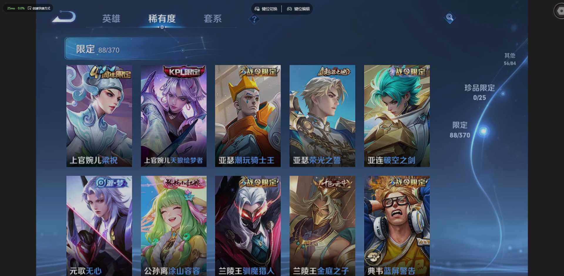 实名: 可修改 贵族等级: V7 英雄数: 128 皮肤数: 262 荣耀水晶