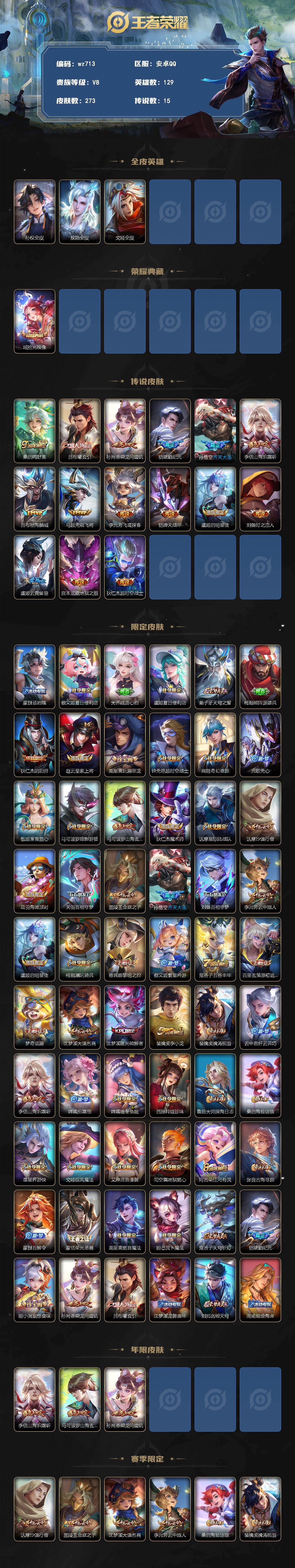 安卓Q-V8-至尊星耀I段位-129英雄-273皮肤-1典藏皮肤-15传说-82史诗