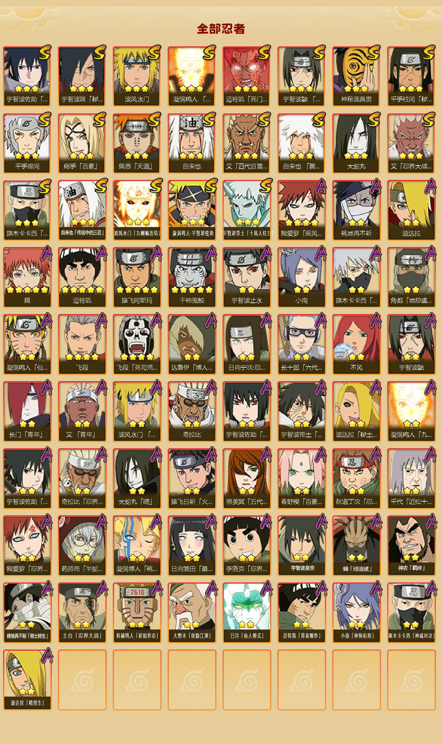 【HY16】V5/S忍21/A忍52/3星纲手「百豪」/2星大野木「侠隐江湖」/3星波风水门「九喇嘛连结」/3星宇智波带土「十尾人柱力」/2星达鲁伊「博人传」/2星宇智波止水/5星猿飞阿斯玛/3星旗木卡卡西「须佐能乎」/2星猿飞日斩「火影继承人」/5星蝎/2星小南「神驹佑将」/2星照美冥「五代目水影」/3星千手扉间/5星迈特凯/3星自来也/2星奇拉比「忍界大战」/2星旗木卡卡西「神威对决」/2星长十郎「六代目水影」/2星蝎「绯流琥」/2星桃地再不斩「秽土转生」/2星春野樱「百豪」/3星迈特凯「死