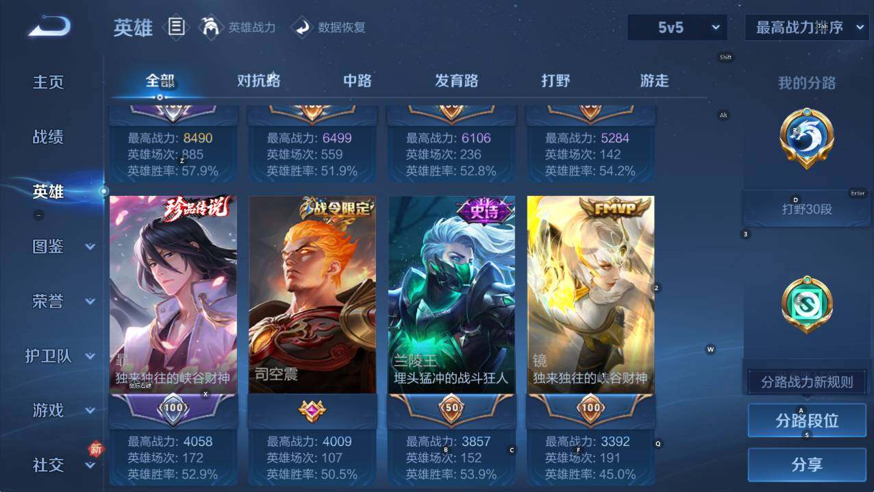 /8400澜 小打野号 澜全皮 贵族7-254皮1典藏14传说2珍品传说4个英雄全皮 安卓手Q384区254皮1典藏14传说0无双2珍品传说V7