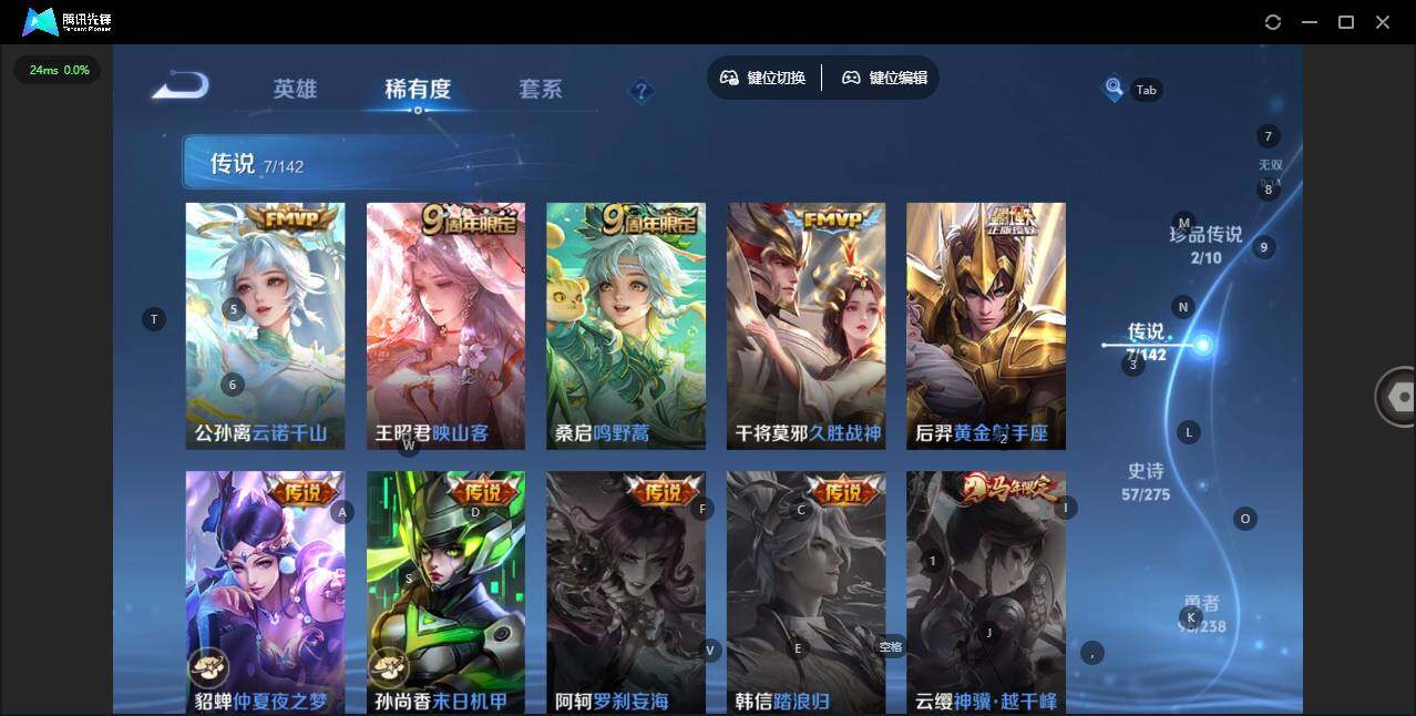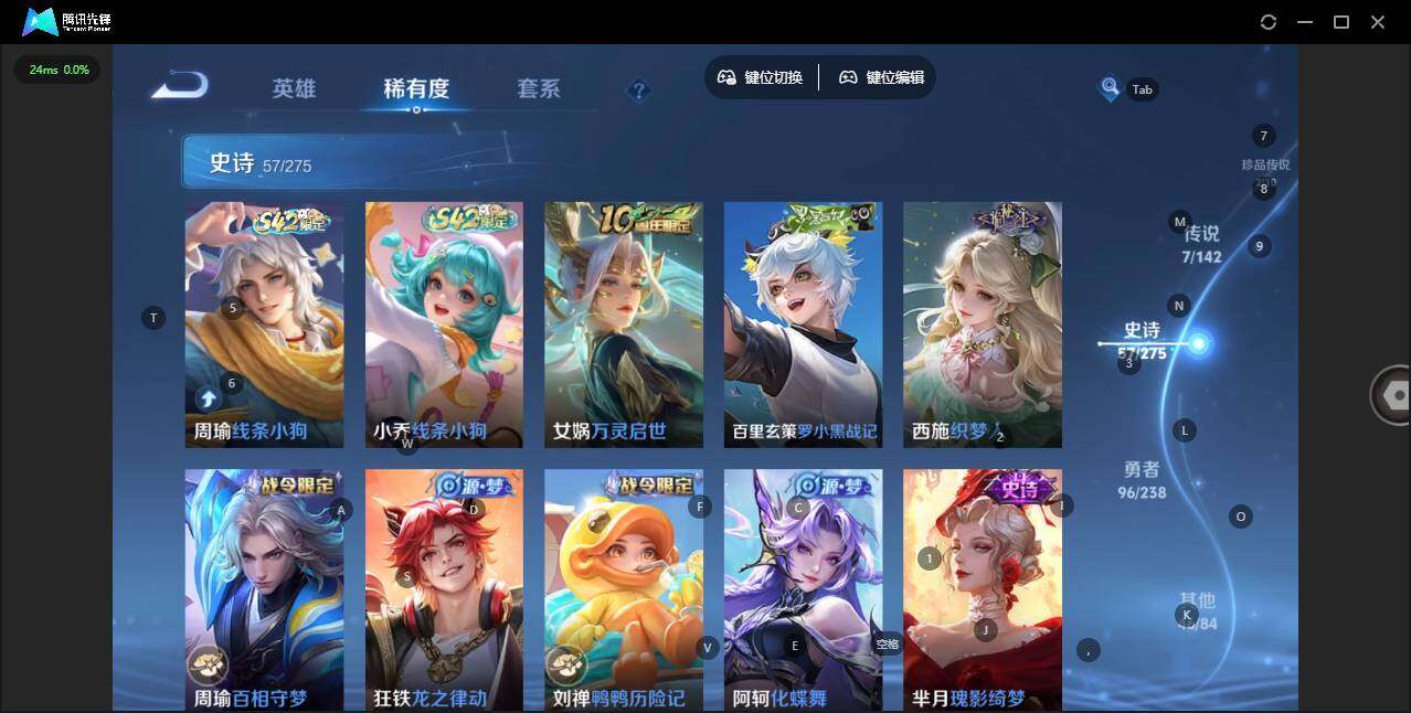 实名: 可修改 贵族等级: V7 英雄数: 127 皮肤数: 209 荣耀水晶