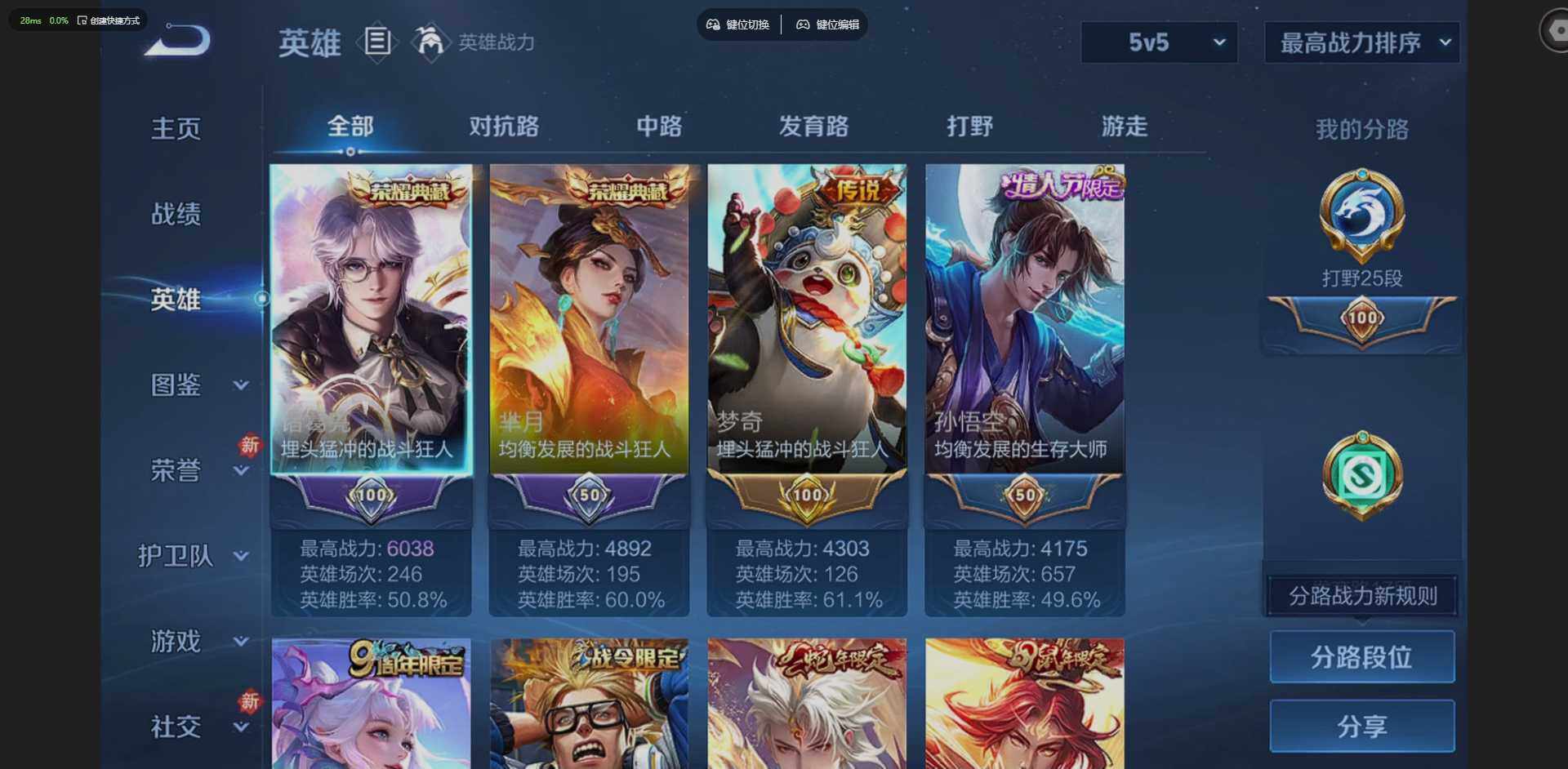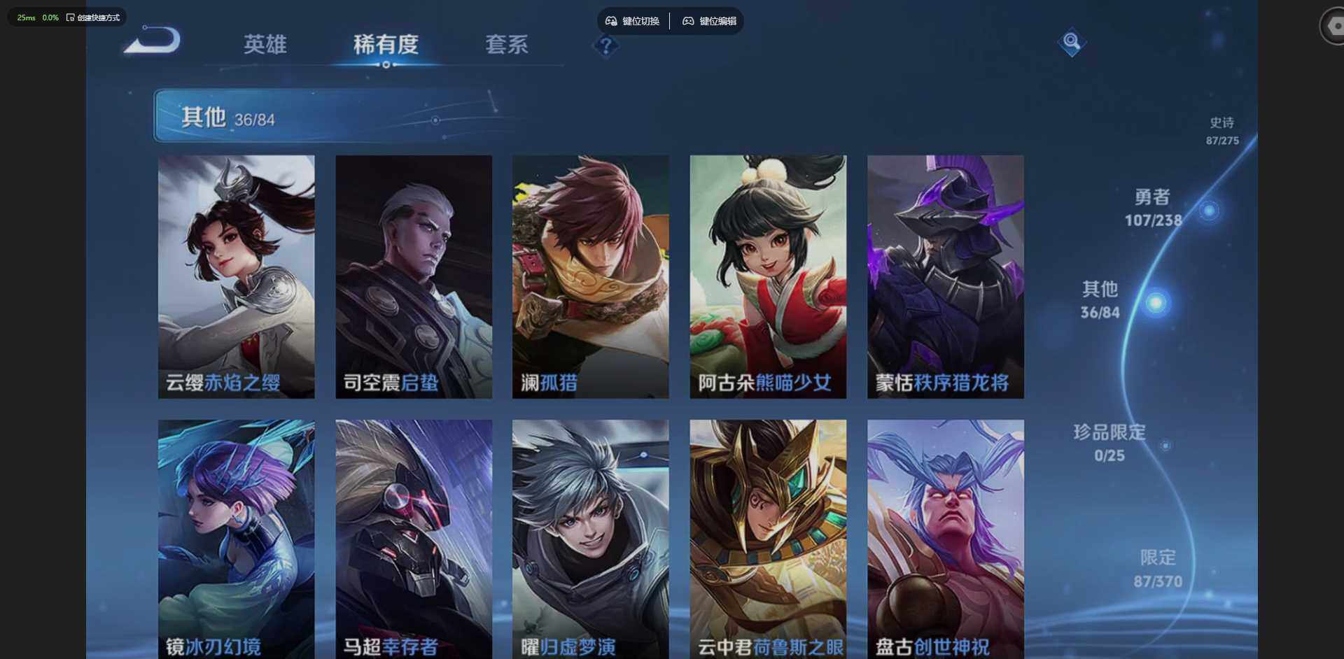 【金标梦奇】实名: 可修改 贵族等级: V8 英雄数: 128 皮肤数: 24