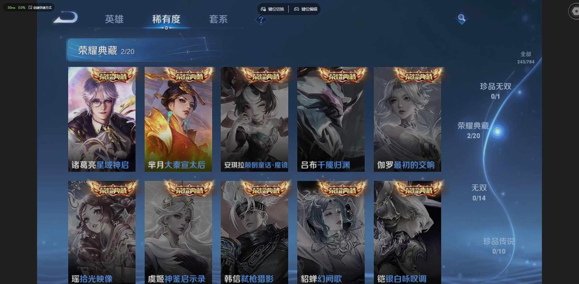 金标梦奇】实名: 可修改 贵族等级: V8 英雄数: 128 皮肤数: 243 荣耀水晶: 大秦宣太后,星域神启 传说皮: 黄金射手座,云鹰飞将,一念神魔,胖达荣荣,时之恋人-刘备 限定皮: 遇见飞天,李小龙,游园惊梦,梁祝,辉光之辰,飞衡,太华,逐梦之影,凤求凰,凤凰于飞,至尊宝,高山流水,玉兔公主,五谷丰年,鸣野蒿,陌上桑,愿照·众生和,愿照·九州拓