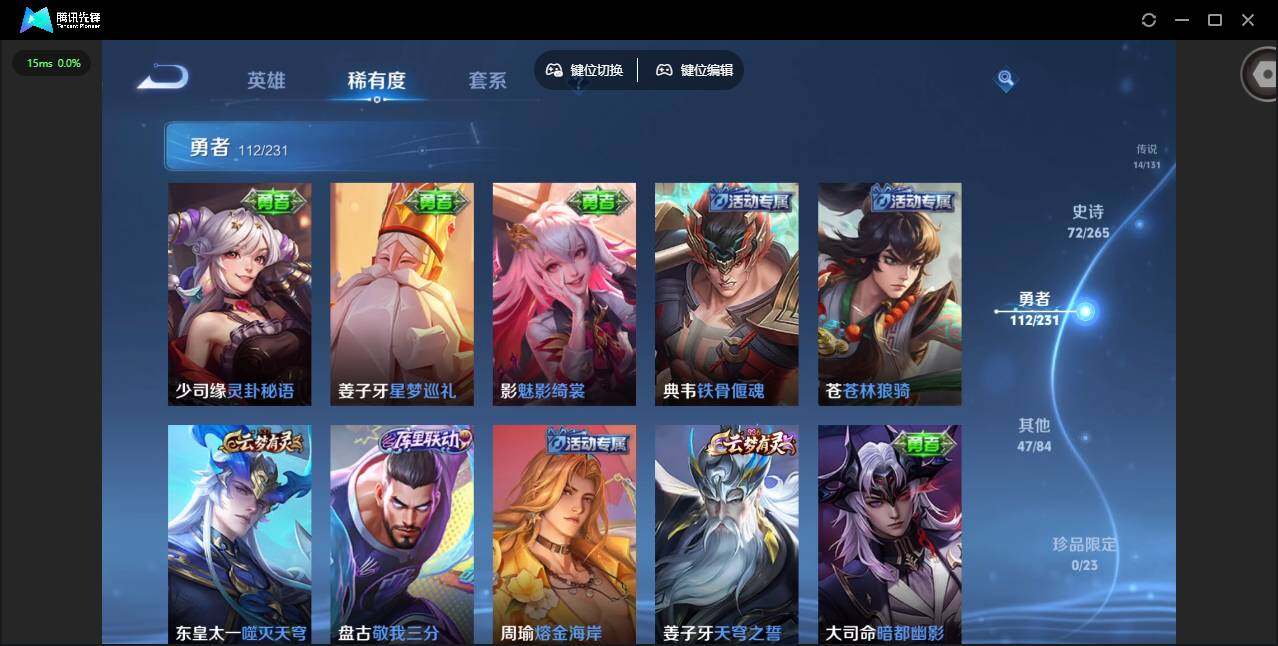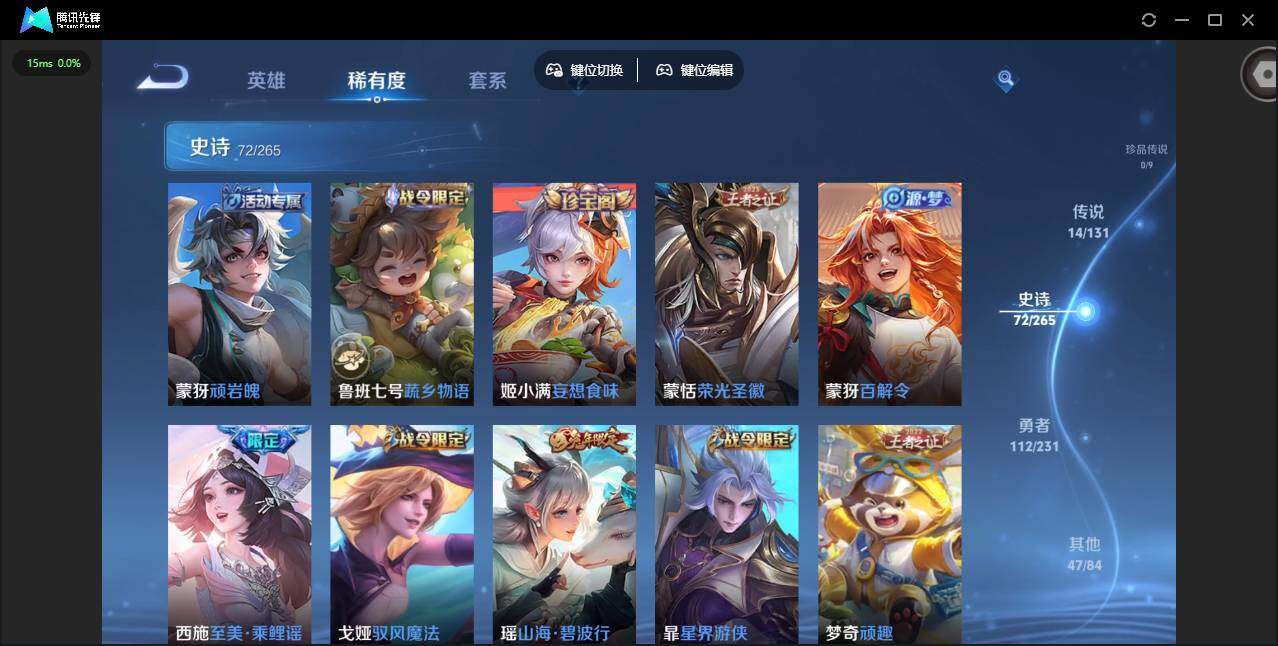 实名: 可修改 贵族等级: V7 英雄数: 124 皮肤数: 245 星传说: 零号·雷霆 传说皮: 冠军飞将,一念神魔,零号·赤焰,游龙清影,淬星耀世,山海·炽霜斩,山海·琳琅生,山海·苍雷引,永恒水手月亮,幻光神枪 限定皮: 李小龙,梁祝,御风骁将,时雨天司,神威,飞衡,逐梦之影,朱雀志,默契交锋-兰陵王,大圣娶亲,高山流水,孙行者,猪悟能,五谷丰年,山海·碧