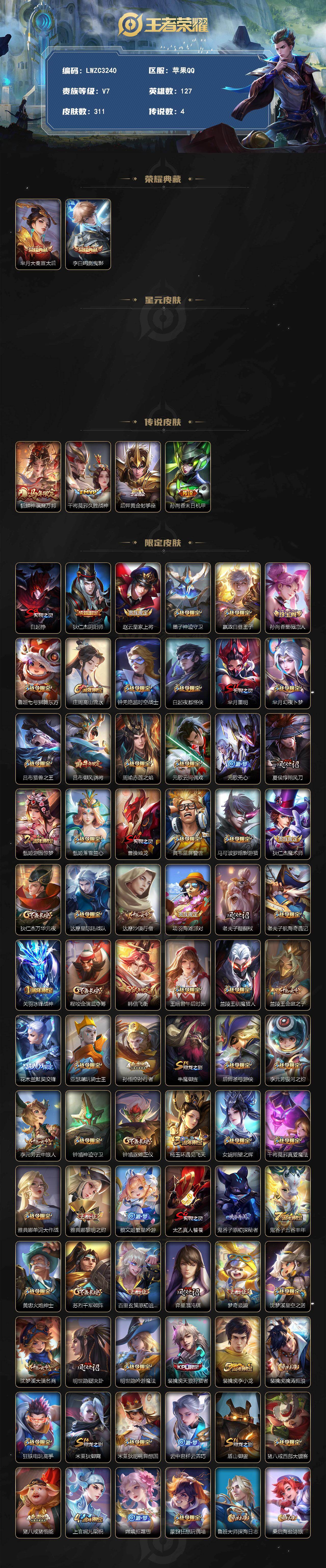 可二次【特价出售/店主推荐/1省标/16市标/35段对抗/32段打野】:苹果Q-V7-最强王者段位-127英雄-311皮肤-1星元-2典藏皮肤-4传说-85史诗【英雄全皮】:孙权全皮,猪八戒全皮,敖隐全皮【荣耀典藏】:芈月大秦宣太后,李白鸣剑曳影【传说皮肤】:貂蝉神骥聚万邦,干将莫邪久胜战神,后羿黄金射手座,孙尚香末日机甲【限定皮肤】:白起狰,狄仁杰阴阳师,赵云皇家上将,墨子神迹守卫,嬴政白昼王子,孙尚香蔷薇恋人,鲁班七号狮舞东方,庄周高山流水,钟无艳超时空战士,白起夜都怪侠,芈月重明,芈月幻夜