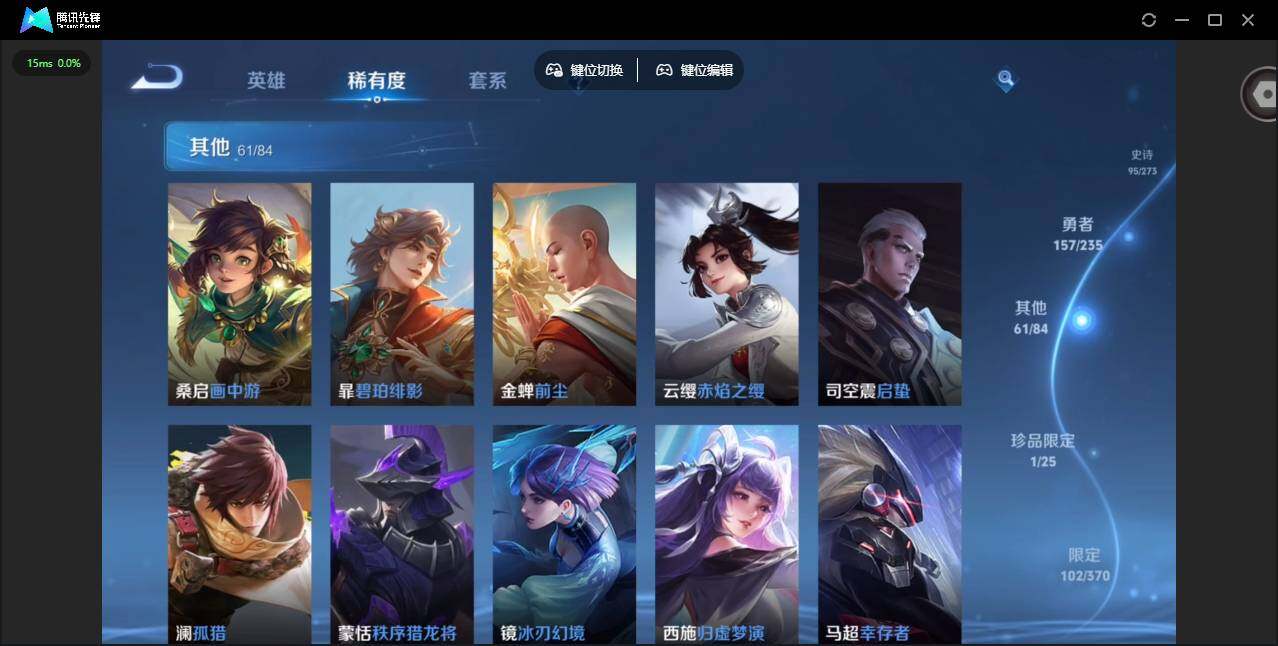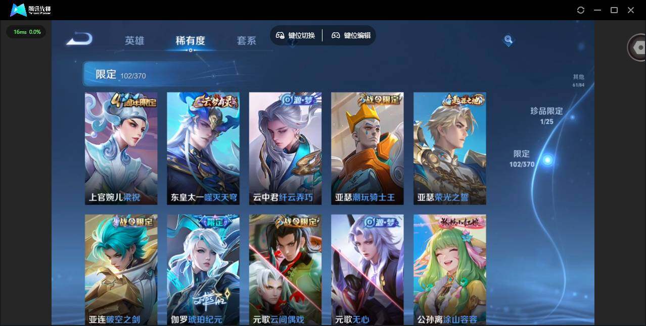 贵族等级: V7 英雄数: 128 皮肤数: 327 荣耀水晶: 九霄神辉 珍