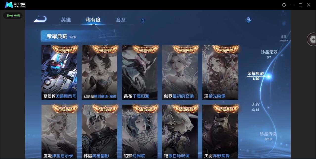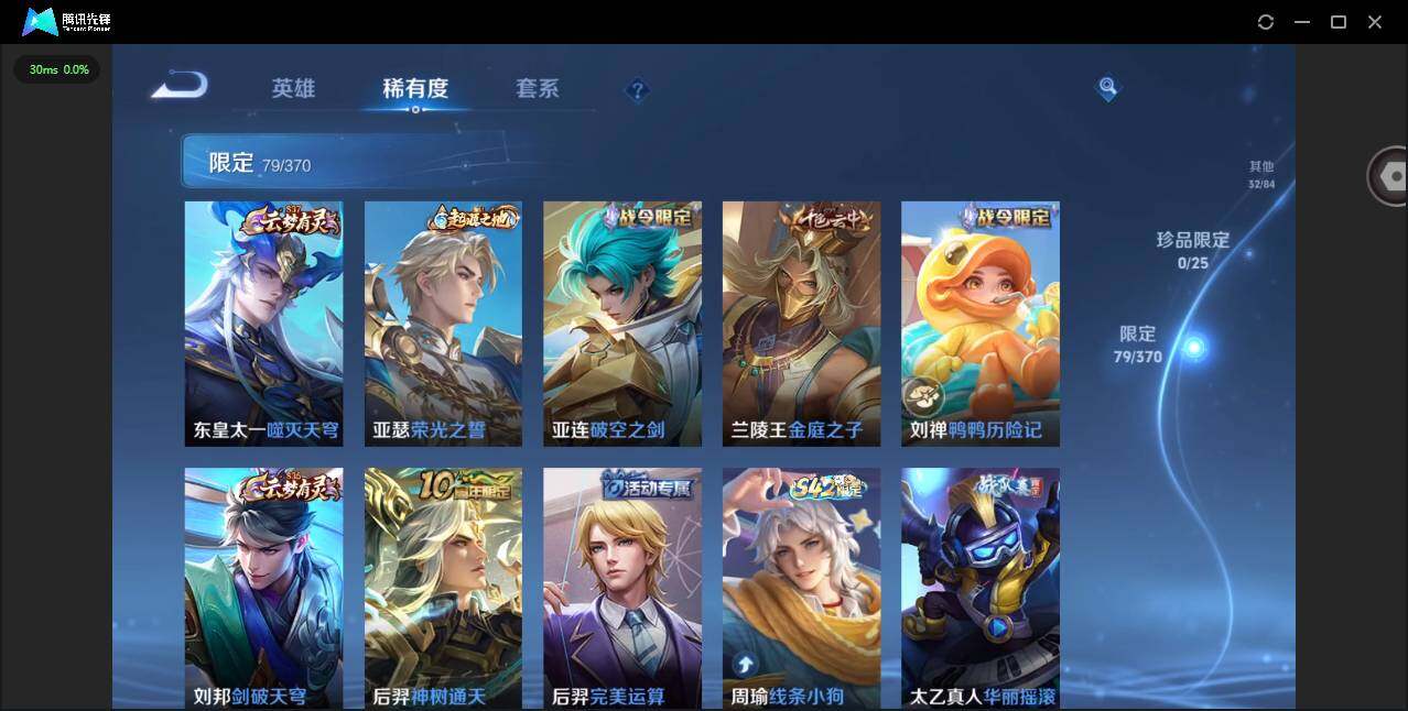 贵族等级: V7 英雄数: 127 皮肤数: 255 荣耀水晶: 无限飓风号 星传说: 幽冥之眼,金色仲夏夜 传说皮: 黄金射手座,云鹰飞将,久胜战神,地狱之眼,胖达荣荣,游龙清影,无双飞将,貂蝉曦玄引,幻光神枪,神树通天,神骥·聚万邦 限定皮: 李小龙,游园惊梦,引擎之心,至尊宝,高山流水,五谷丰年,鸣野蒿,愿照·众生和,愿照·九州拓