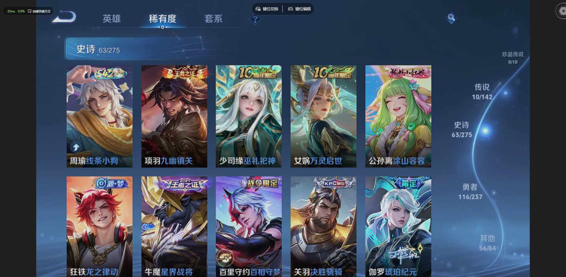 实名: 可修改 贵族等级: V7 英雄数: 128 皮肤数: 246 荣耀水晶