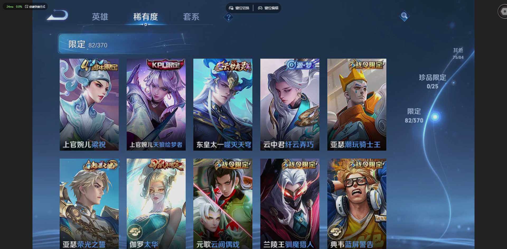 实名: 可修改 贵族等级: V8 英雄数: 127 皮肤数: 268 荣耀水晶