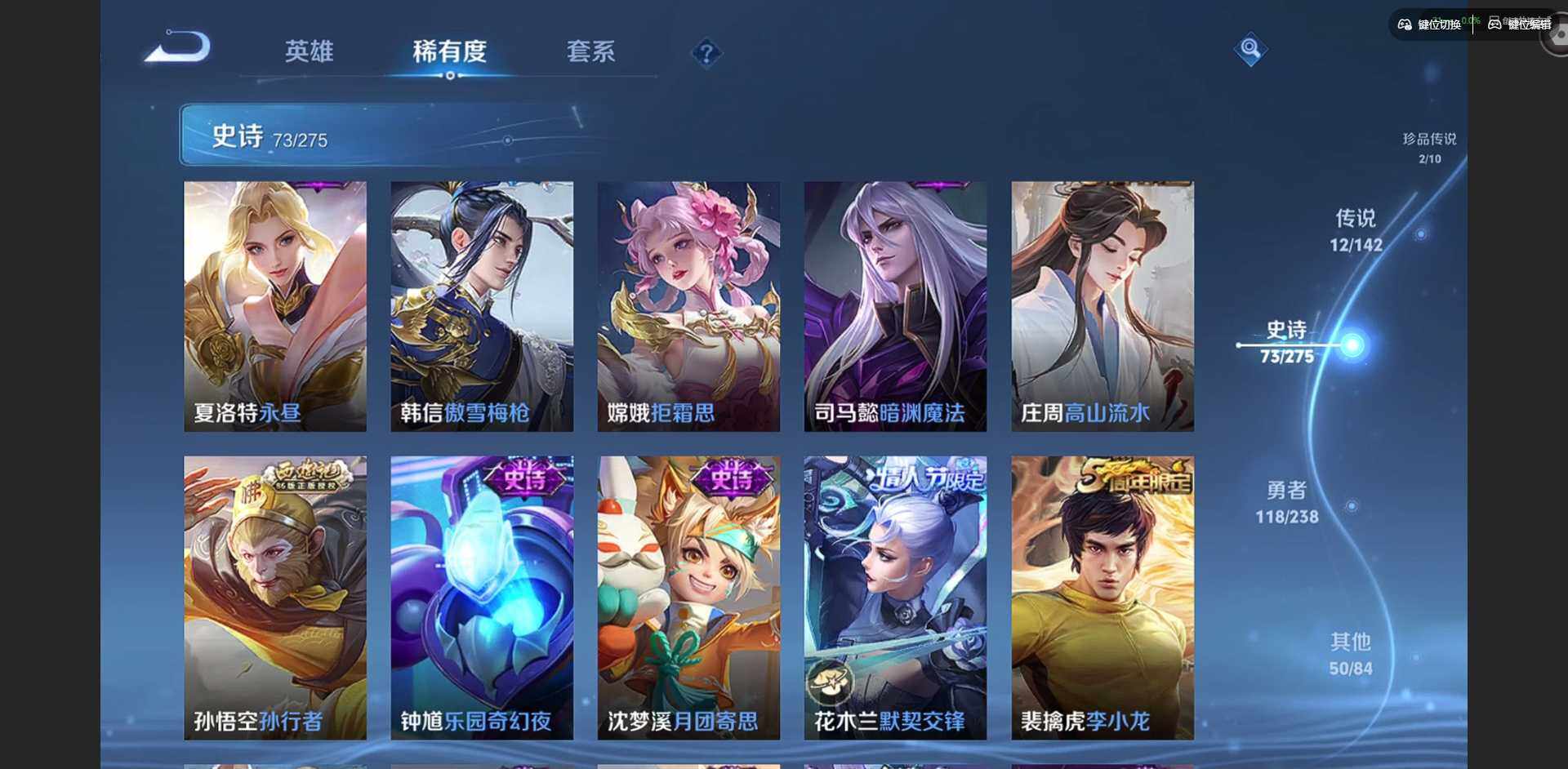 /贵族等级: V7 英雄数: 124 皮肤数: 256 荣耀水晶: 鸣剑·曳影 珍品传说: 怪盗基德,时之奇旅-孙策 传说皮: 云鹰飞将,久胜战神,一念神魔,音你心动-周瑜,胖达荣荣,时之恋人-刘备,挚爱之约,无双飞将,妄想实况 限定皮: 李小龙,梁祝,凤求凰,玄武志,默契交锋-花木兰,高山流水,孙行者,傲雪梅枪,五谷丰年,诗剑行,鸣野蒿