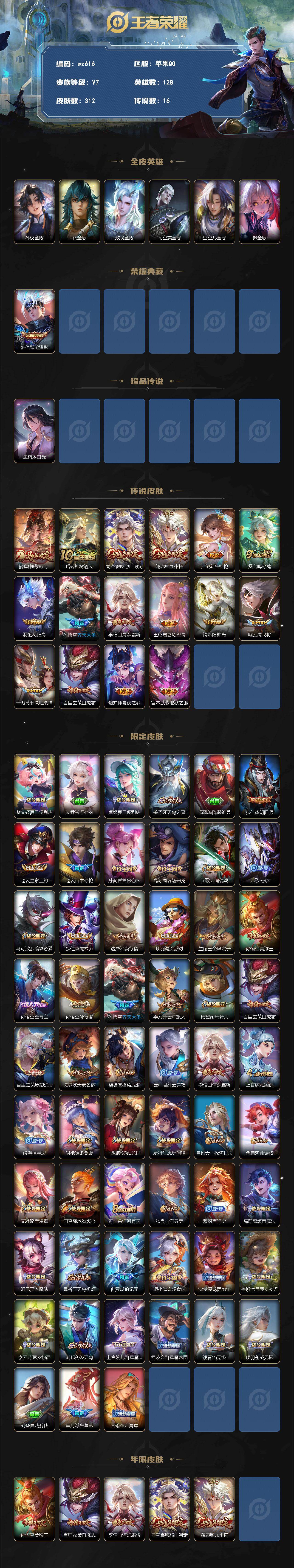 苹果Q-V7-最强王者段位-128英雄-312皮肤-1典藏皮肤-1珍品传说-1