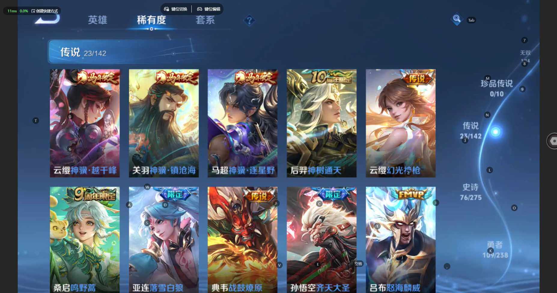 【传说皮肤】:云缨神骥越千峰,关羽神骥镇沧海,马超神骥逐星野,后羿神树通天,云缨幻光神枪,桑启鸣野蒿,亚连落雪白狼,典韦战鼓燎原,孙悟空齐天大圣,吕布怒海