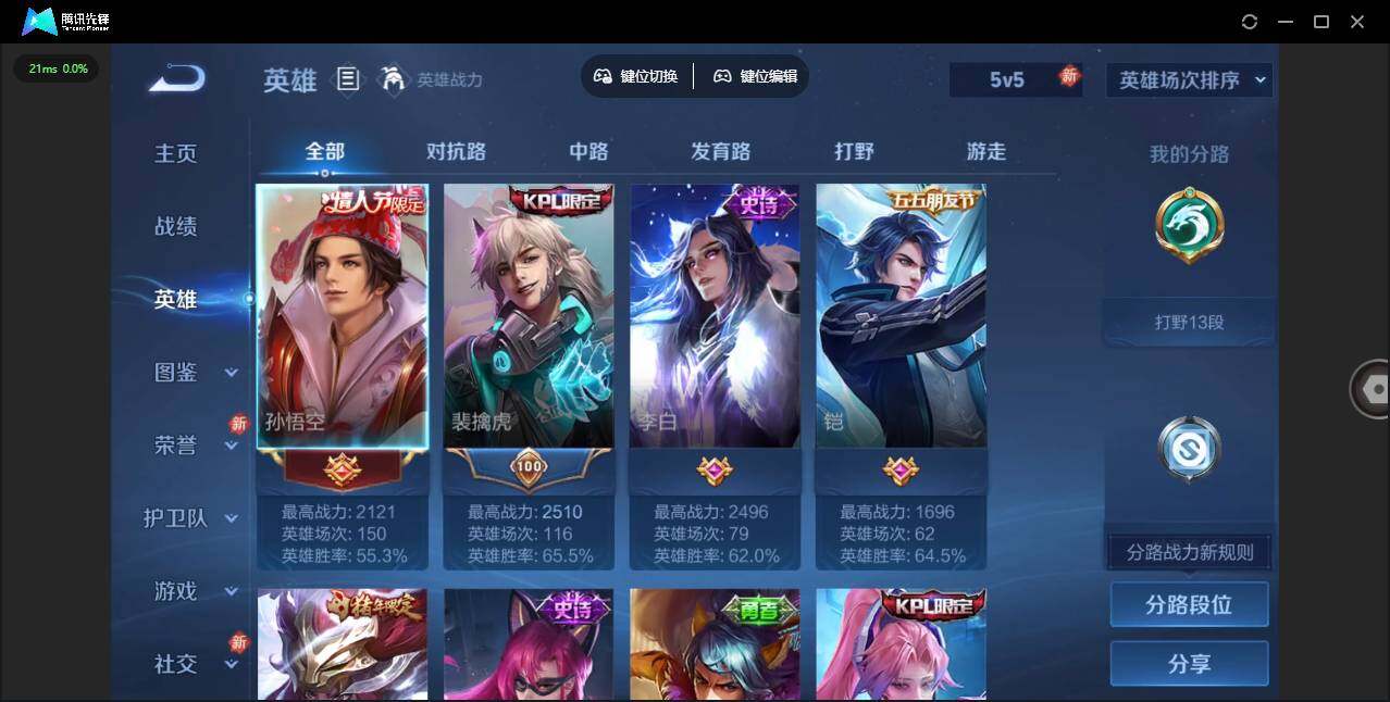 实名: 可修改 贵族等级: V9 英雄数: 114 皮肤数: 161 传说皮: