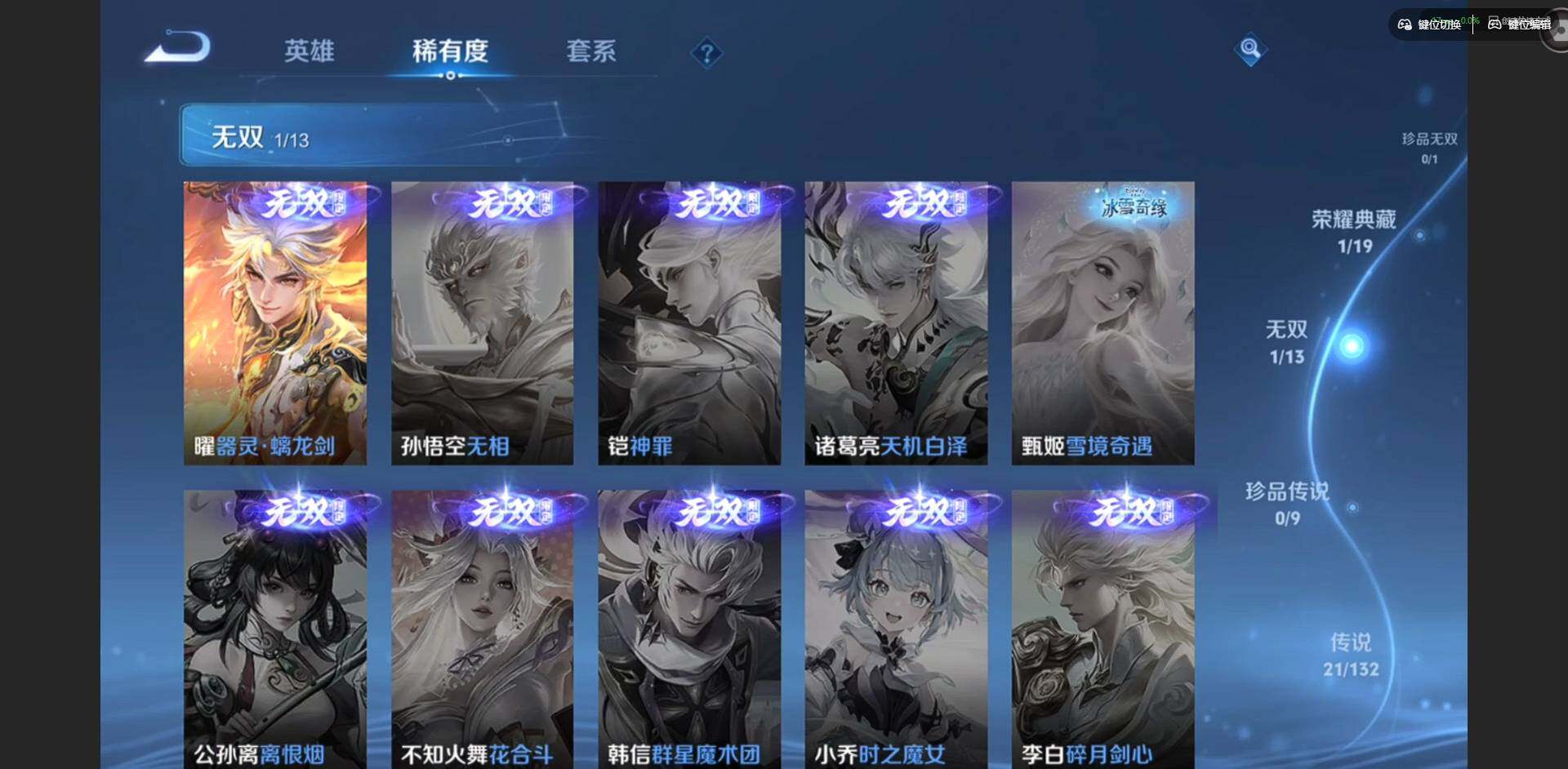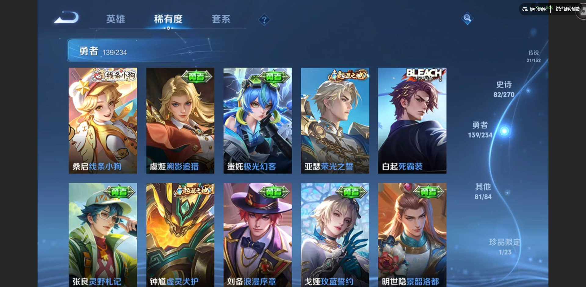 贵族等级: V8 英雄数: 128 皮肤数: 325 荣耀水晶: 武则天,鸣剑·曳影 无双皮: 器灵·螭龙剑 星传说: 幻海之心,未来机甲,零号·雷霆,星际治安官 传说皮: 黄金狮子座,冠军飞将,云鹰飞将,猫影幻舞,久胜战神,末日机甲-孙尚香,地狱火,零号·赤焰,海洋之心,李逍遥,超时空战士-狄仁杰,挚爱之约,记忆之芯,云诺千山 限定皮: 冰锋战神,遇见飞天,李小龙