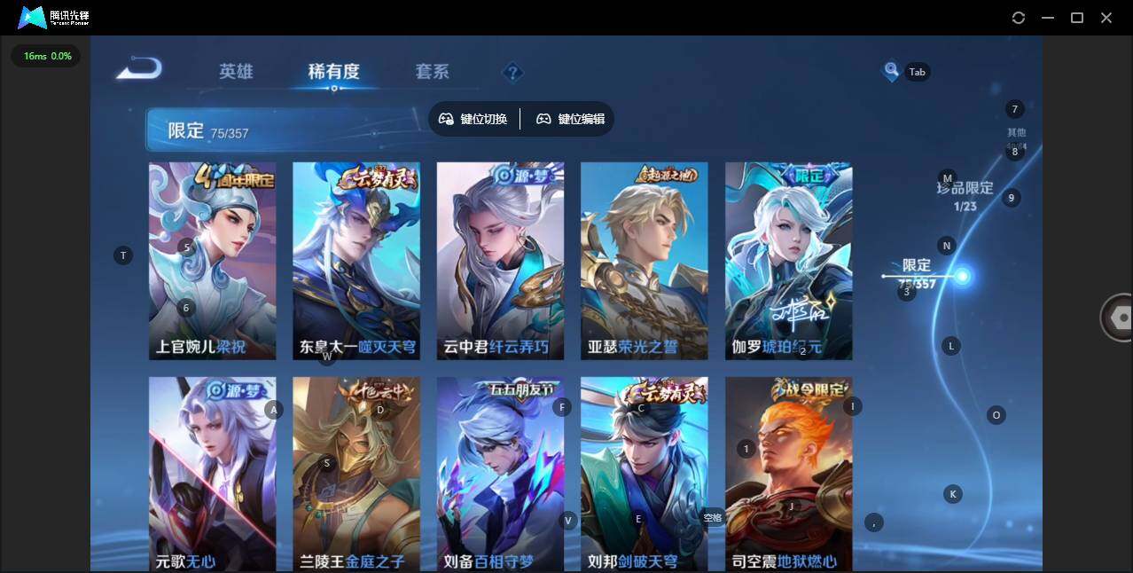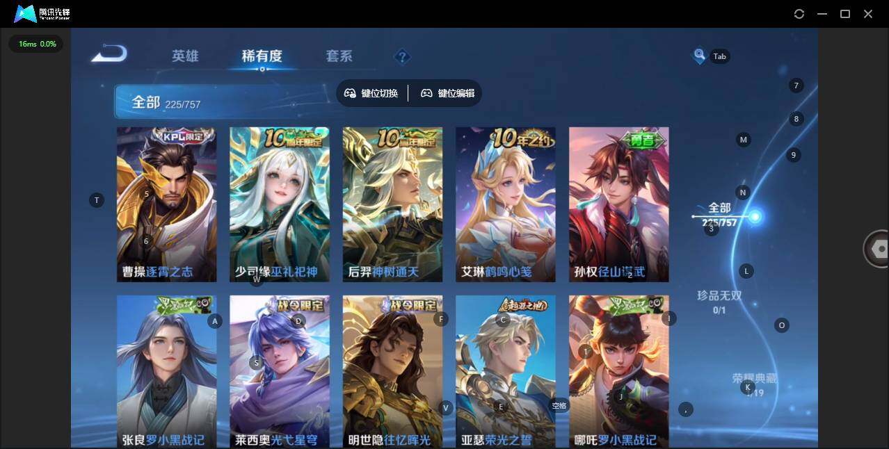 实名: 可修改 贵族等级: V7 英雄数: 127 皮肤数: 225 荣耀水晶