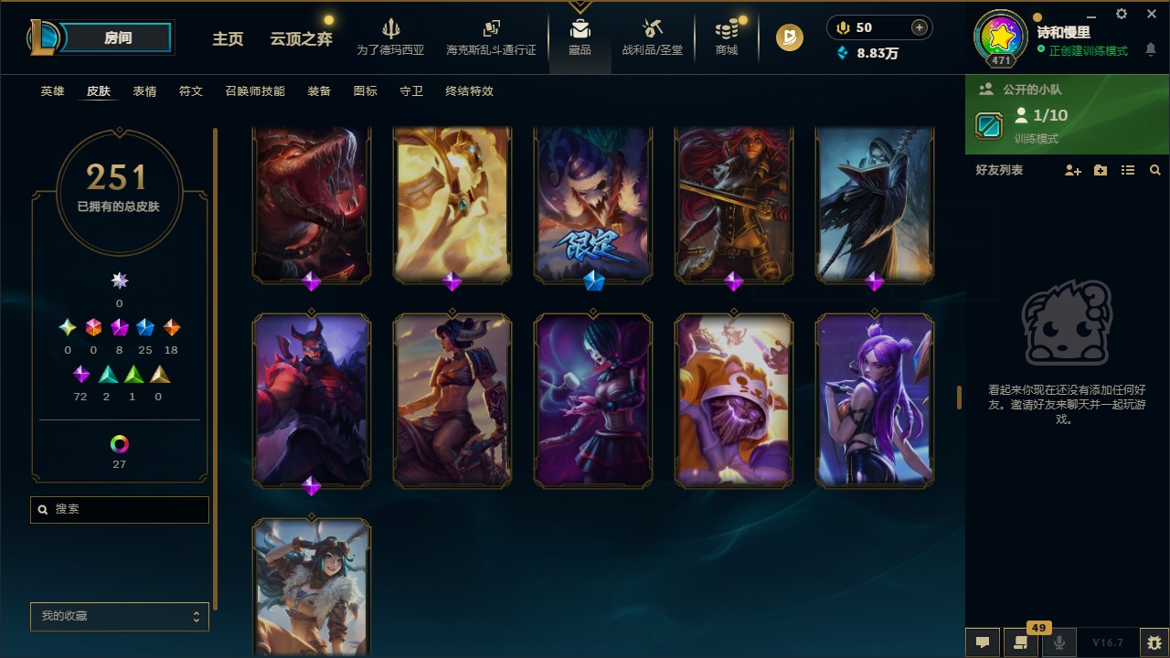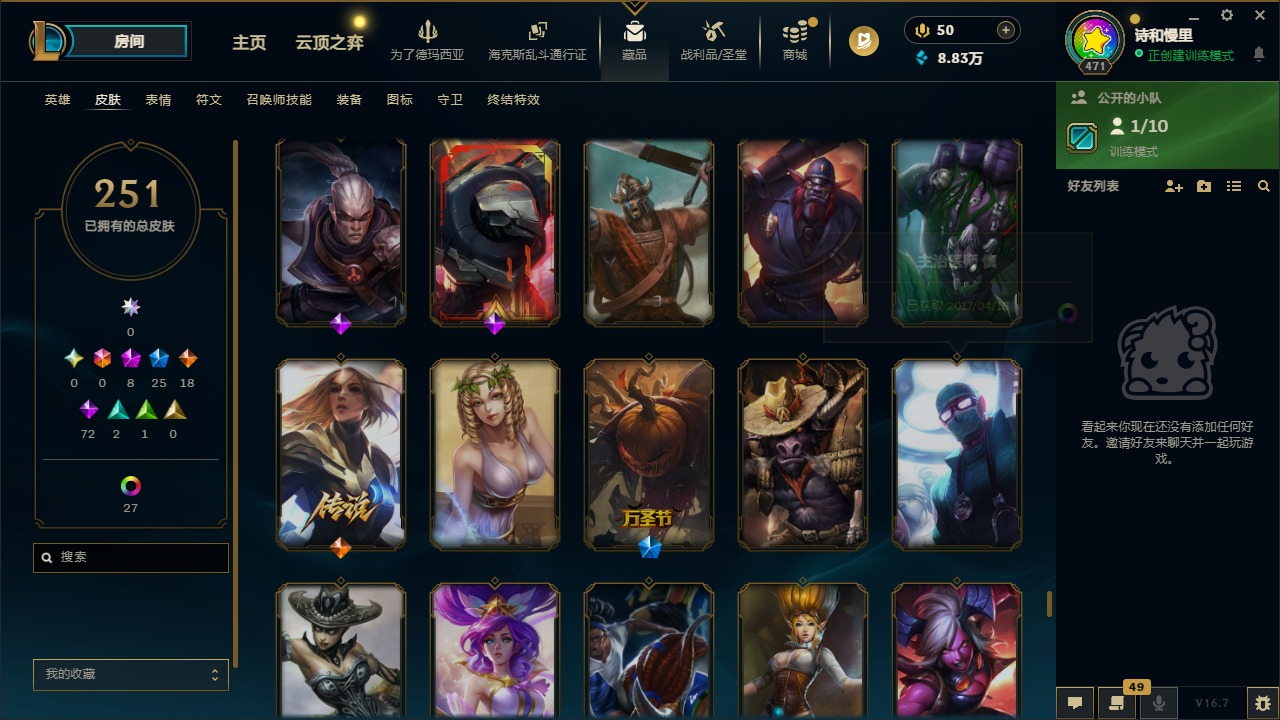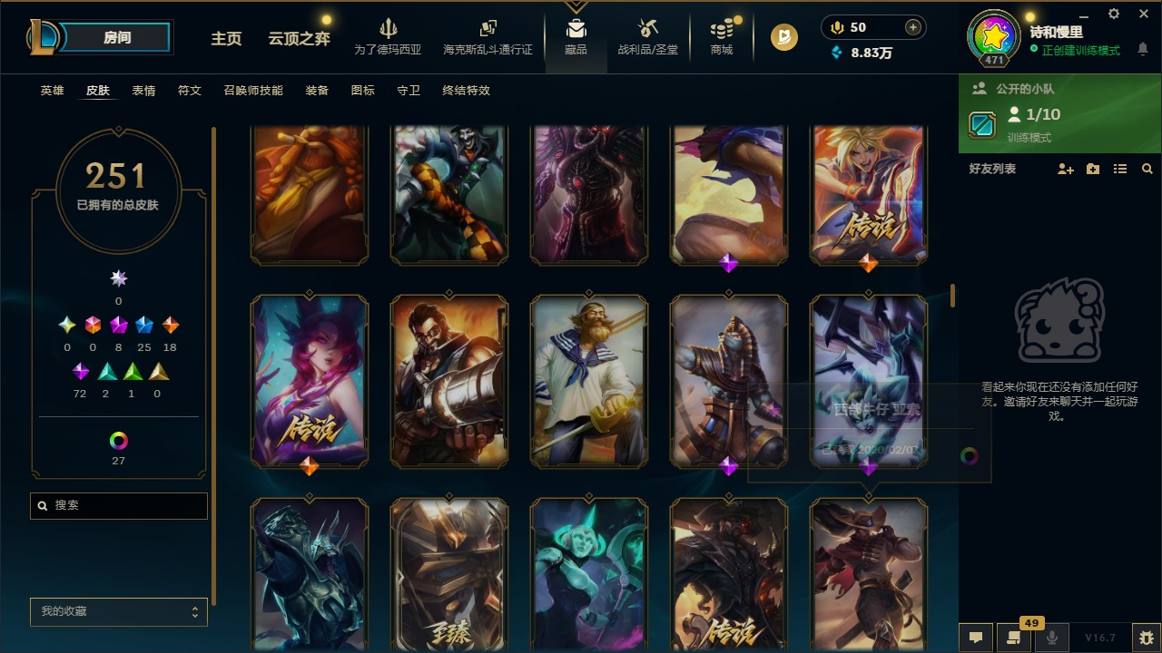 8神话 25限定 19传说 72史诗 251皮肤 35炫彩 172英雄 可二次 可修