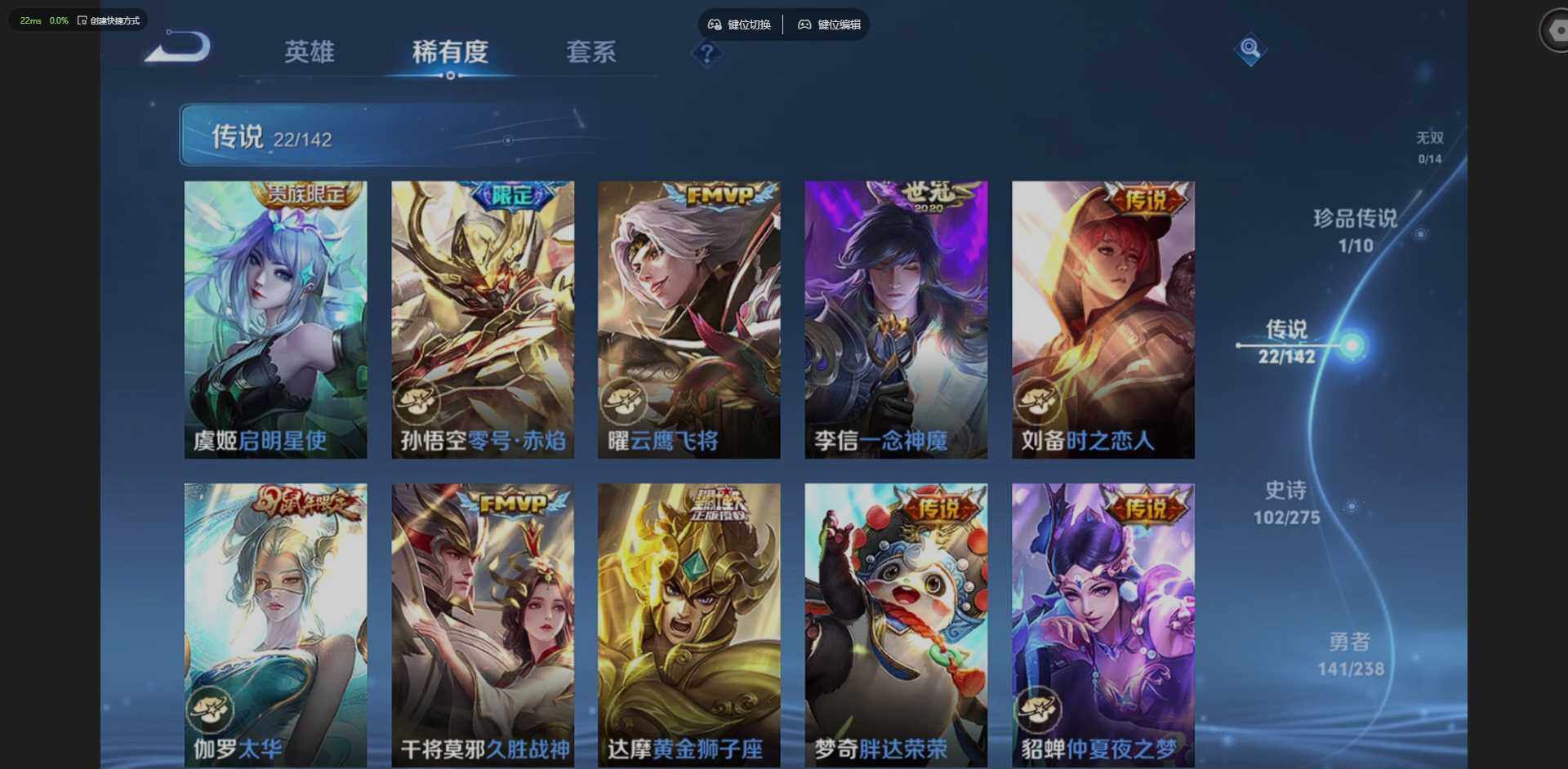 实名: 可修改 贵族等级: V8 英雄数: 126 皮肤数: 317 荣耀水晶: 鸣剑·曳影,九霄神辉 珍品传说: 怪盗基德 星传说: 幽冥之眼,金色仲夏夜 传说皮: 黄金狮子座,云鹰飞将,久胜战神,一念神魔,仲夏夜之梦,零号·赤焰,地狱之眼,胖达荣荣,时之恋人-刘备,淬星耀世,碎云,澜逐花归海,云诺千山 限定皮: 冰锋战神,遇见飞天,李小龙,奔雷神使,祈雪灵祝,游