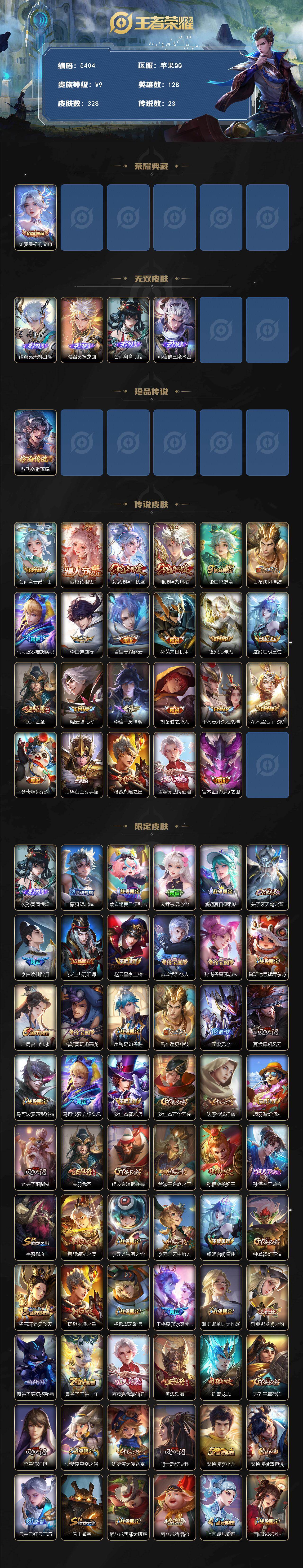 可二次 贵族9-财神纳福、凤鸣九霄天幕-328皮-1典藏-4无双-1珍品传说-23传说-7全皮英雄-4改名卡 苹果手Q117区