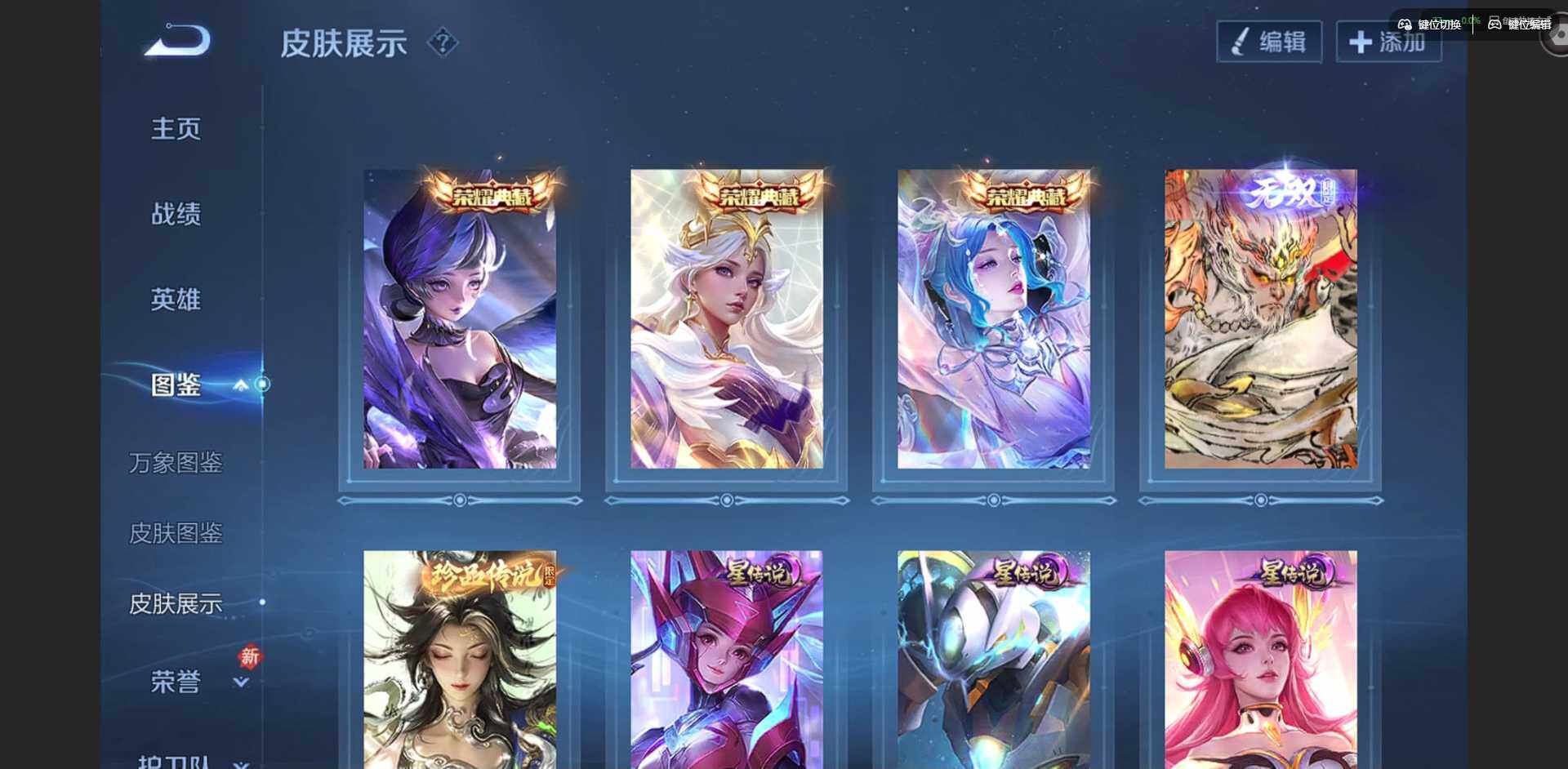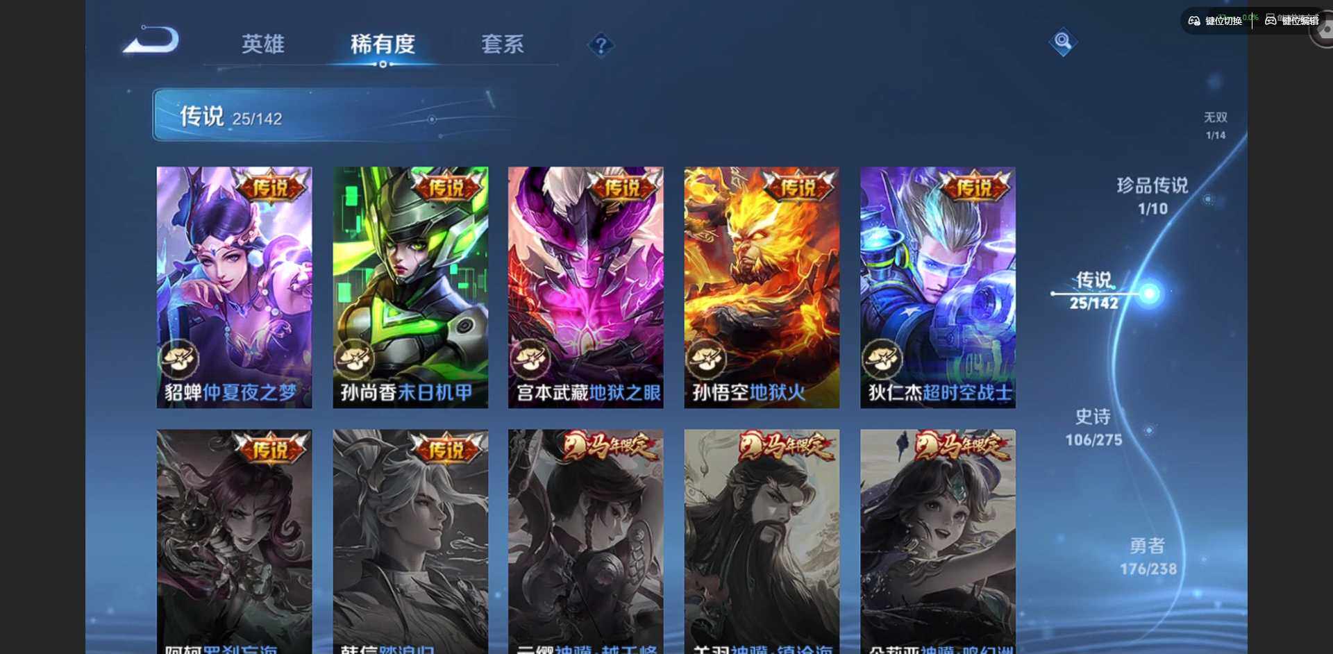 族等级: V8 英雄数: 128 皮肤数: 392 荣耀水晶: 天鹅之梦,幻阙歌,神鉴启示录 无双皮: 无相 珍品传说: 沧流箭 星传说: 未来机甲,零号·雷霆,金色仲夏夜,星际治安官,无限倾慕 传说皮: 黄金狮子座,黄金射手座,冠军飞将,云鹰飞将,绛天战甲,黄金白羊座,久胜战神,末日机甲-孙尚香,地狱火,仲夏夜之梦,零号·赤焰,地狱之眼,胖达荣荣,超时空战士-狄