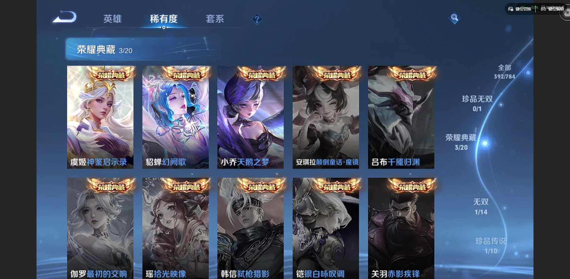 贵族等级: V8 英雄数: 128 皮肤数: 392 荣耀水晶: 天鹅之梦,幻