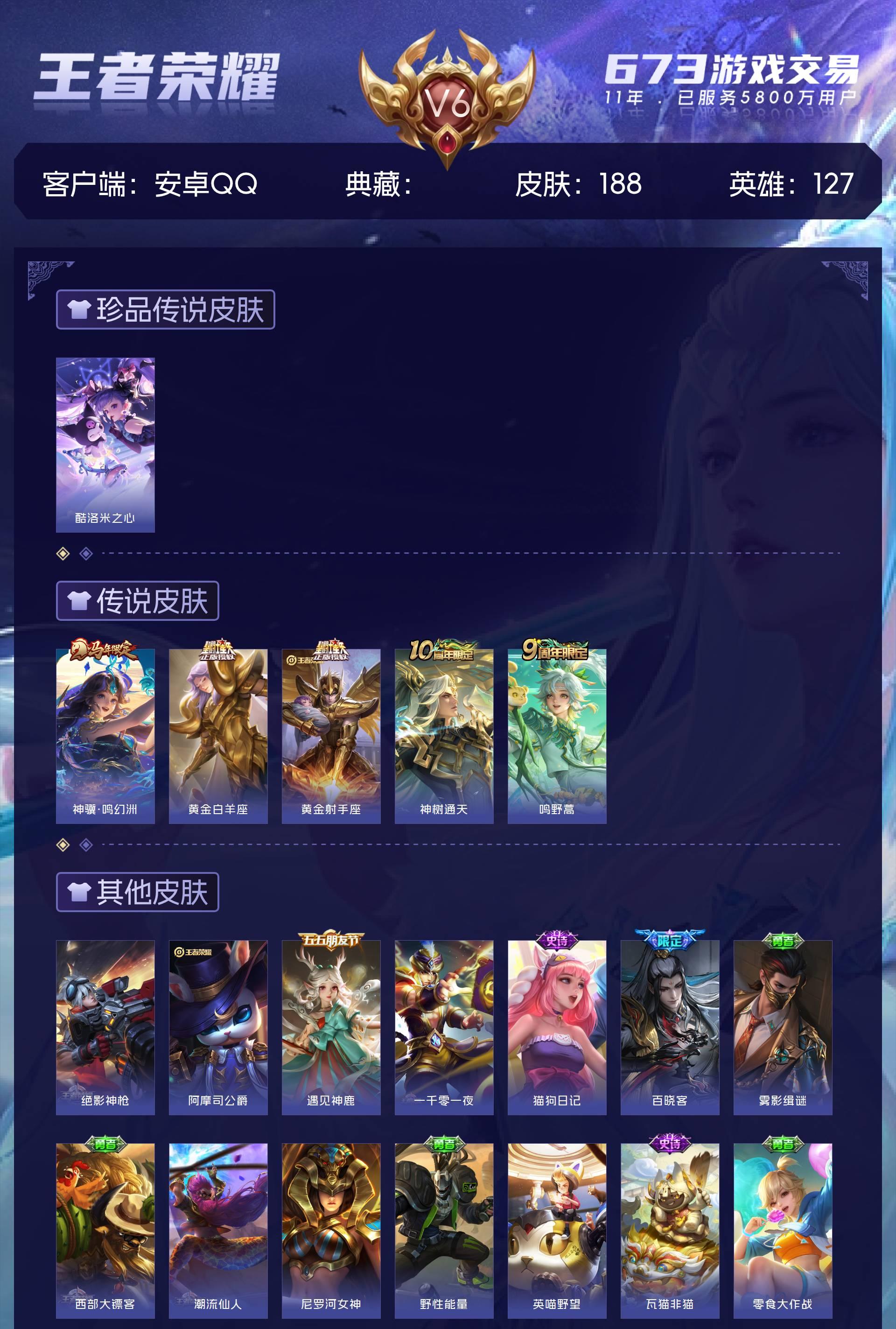V6 皮肤188 英雄127 尊贵铂金 珍品传说1 传说5