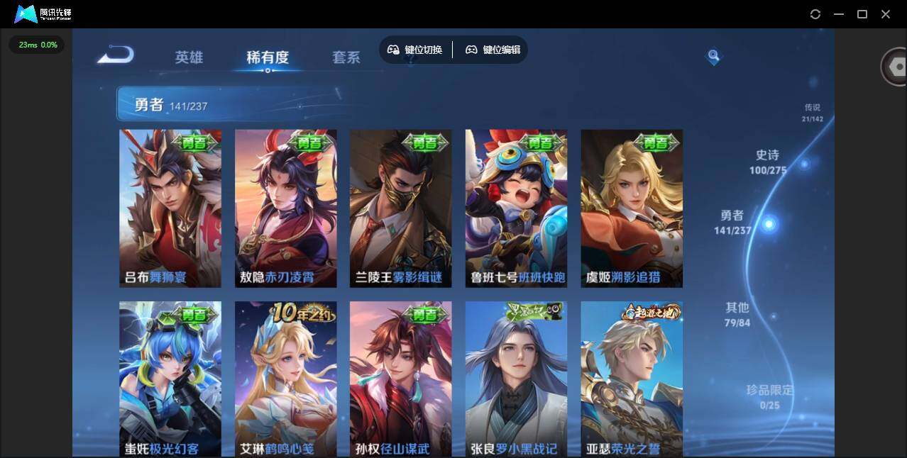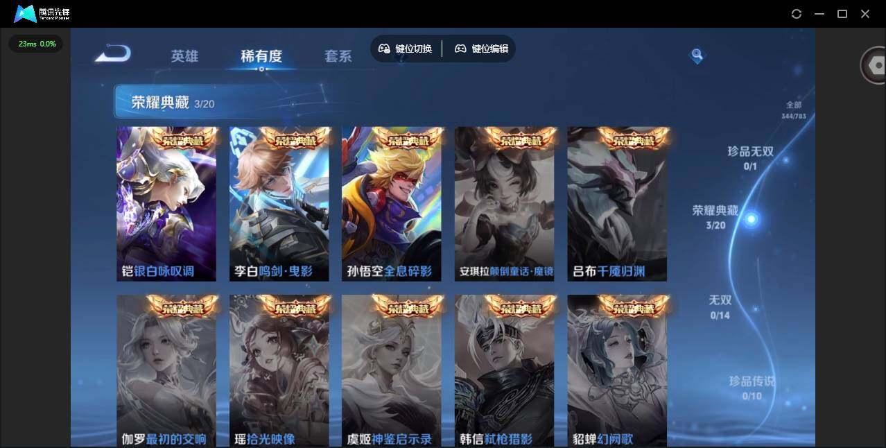 贵族等级: V8 英雄数: 128 皮肤数: 344 荣耀水晶: 鸣剑·曳影,全息碎影,银白咏叹调 星传说: 未来机甲,金色仲夏夜 传说皮: 黄金狮子座,黄金白羊座,猫影幻舞,炽阳神光,一念神魔,末日机甲-孙尚香,地狱火,仲夏夜之梦,地狱之眼,时之恋人-刘备,超时空战士-狄仁杰,山海·炽霜斩,鹤羽星尊,乘龙·铭钟鼎,铠冥王哈迪斯,祥瑞亨通,神骥·聚万邦 限定皮: