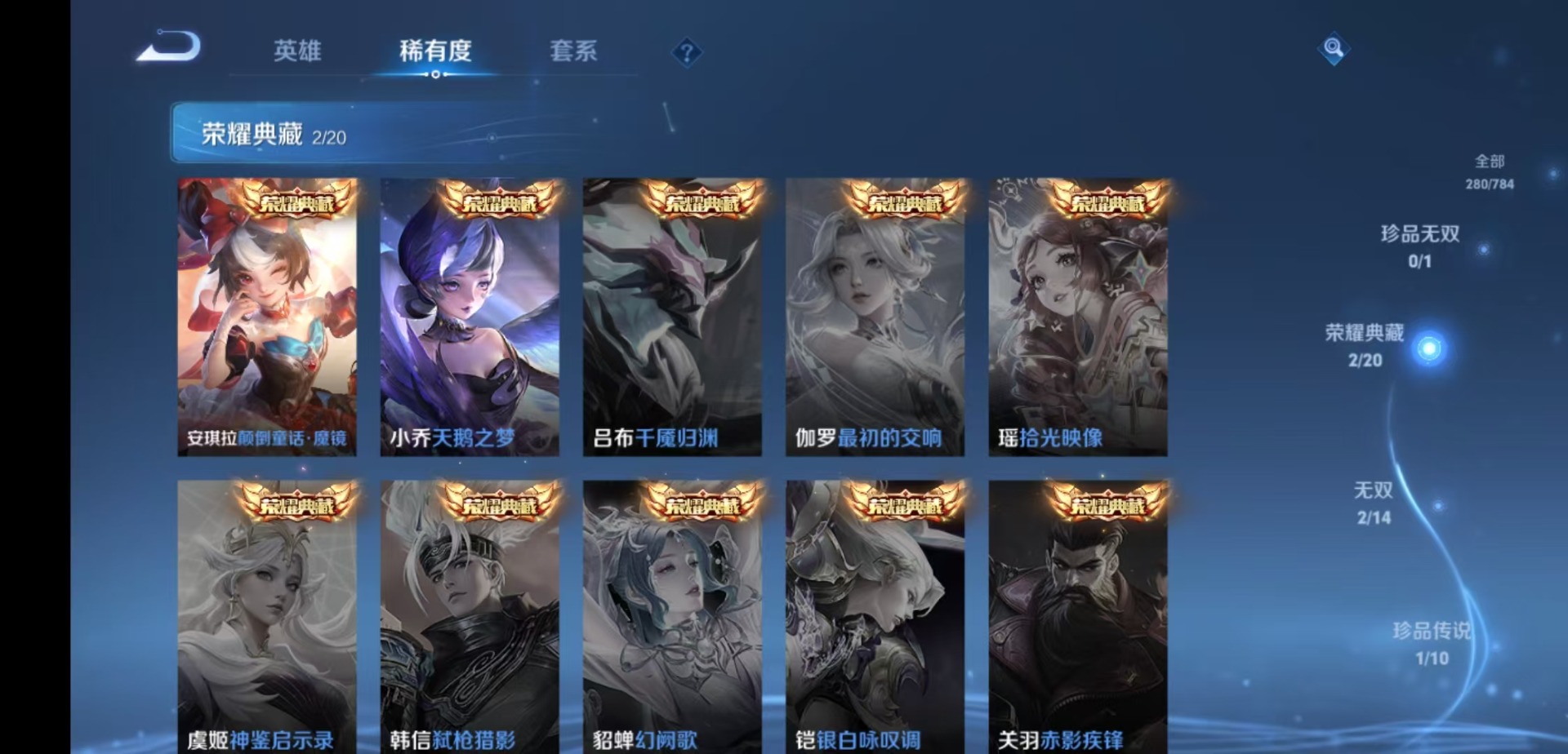 [17892666]实名: 可修改 性别: 女号 贵族等级: V8 英雄数: 127 皮肤数: 280 荣耀水晶: 天鹅之梦,颠倒童话·魔镜 无双皮: 小乔时之魔女,离恨烟 珍品传说: 怪盗基德 传说皮: 黄金射手座,黄金白羊座,猫影幻舞,久胜战神,仲夏夜之梦,飞鸢探春,游龙清影,遇见胡旋,挚爱花嫁,山海·琳琅生,神骥·鸣幻洲 限定皮: 李小龙,祈雪灵祝,游园惊梦