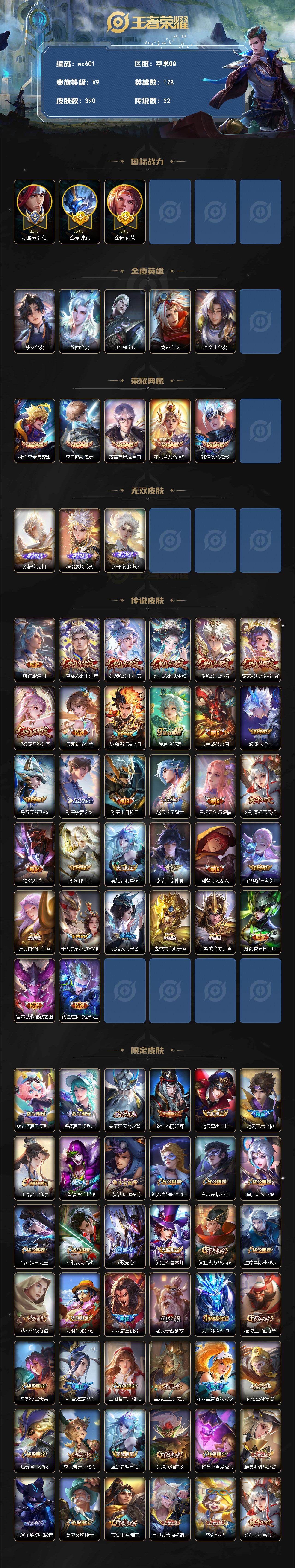 苹果Q-V9-最强王者段位-128英雄-390皮肤-5典藏皮肤-3无双-32传说-108史诗