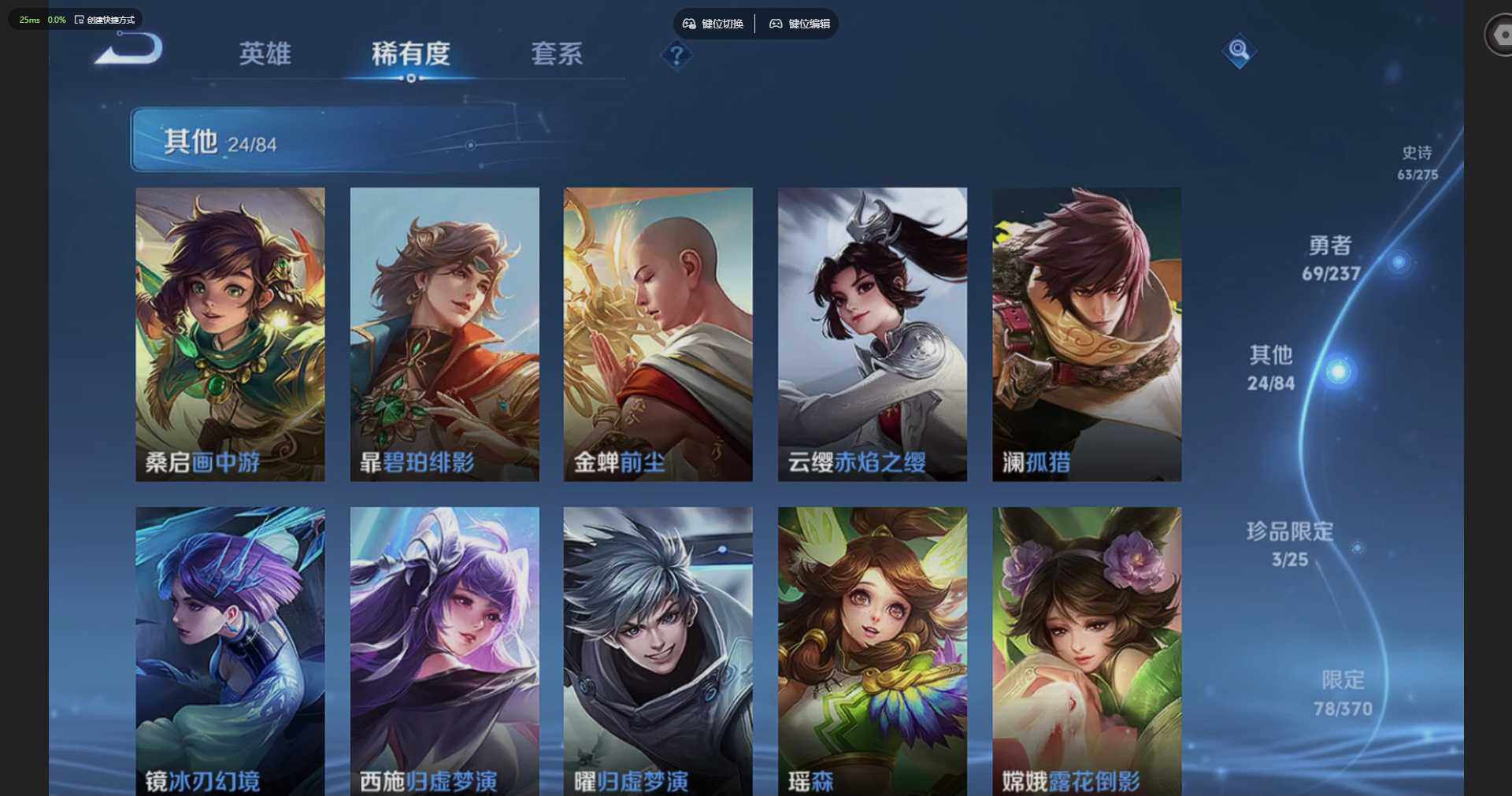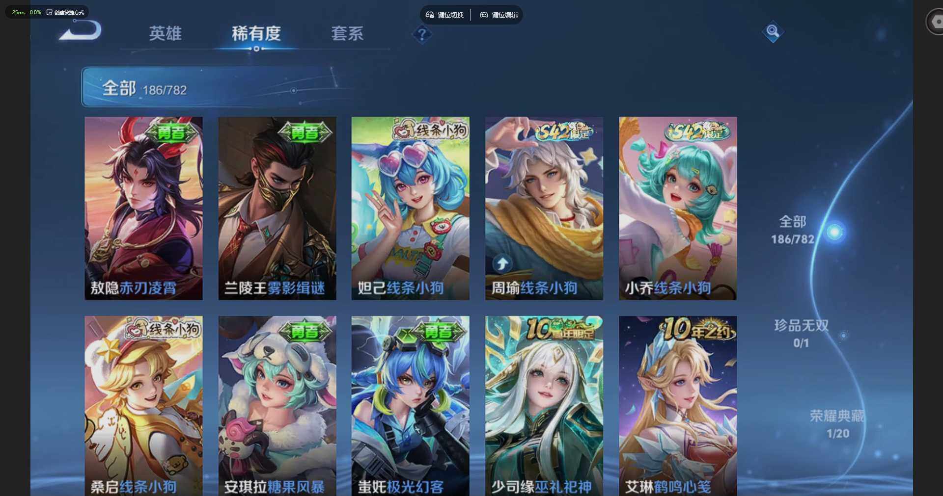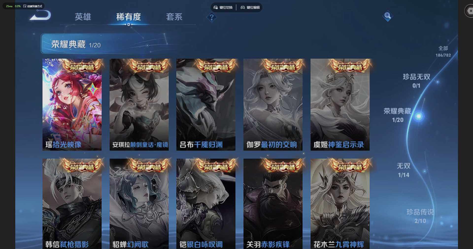 【 皮肤数: 186 荣耀水晶: 拾光映像 无双皮: 真我赫兹(瑶) 珍品传说: 酷洛米之心,大耳狗之梦 星传说: 金色仲夏夜,破晓神光 传说皮: 炽阳神光,仲夏夜之梦,音你心动-小乔,地狱之眼,游龙清影,山海·琳琅生,大乔-时之奇