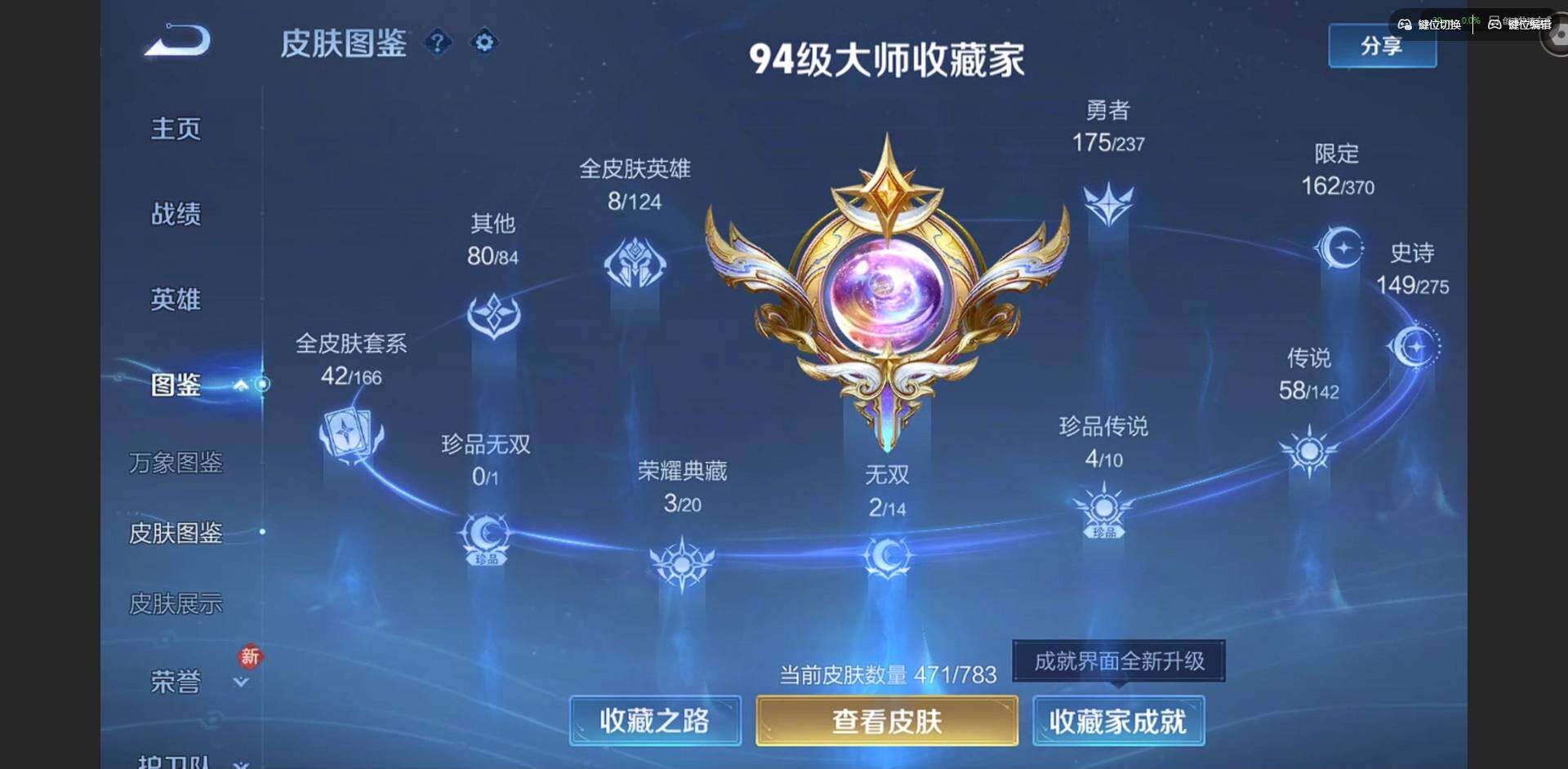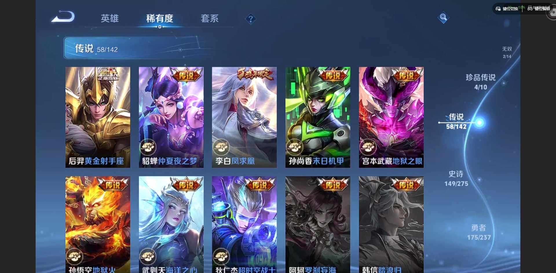 【金标韩信 金标孙悟空 金标苏烈 金标芈月 蛇年限定全套 虎年限定全套 牛年限定全套】贵族等级: V10 英雄数: 129 皮肤数: 471 荣耀水晶: 武则天,大秦宣太后,九霄神辉,神鉴启示录 无双皮: 雪境奇遇-甄姬,器灵·螭龙剑 珍品传说: 江户川柯南,怪盗基德,时之奇旅-孙策,器灵·落星盏 星传说: 幻海之心,金色仲夏夜,岁雨灵司,幻舞叠翠,寅虎·焰心 传说