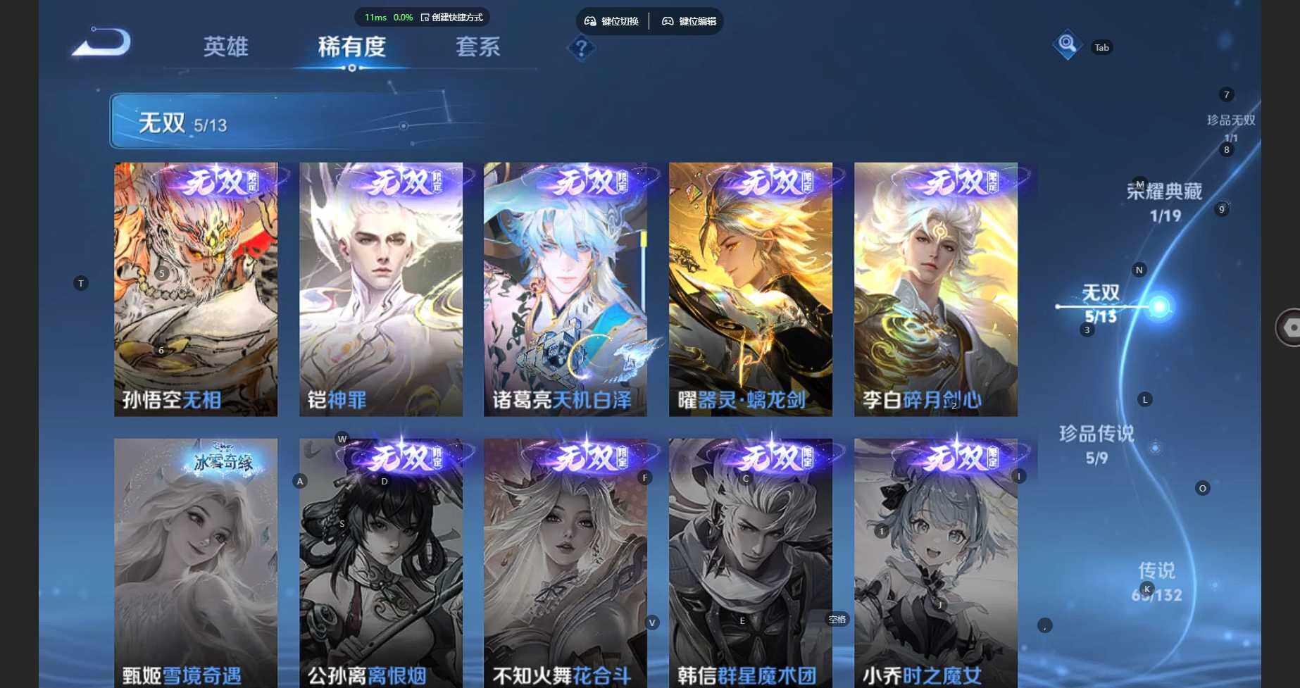 /苹果WX 发育路58段!【国标公孙离!在榜金标公孙离!1.3w战力元流之子!在榜金标元流之子!巅峰全国万强!】2天幕-76皮肤分享-36按键-V10-312皮肤-1典藏皮肤-1珍品无双-5无双-5珍品传说-65传说-98史诗-99限定
