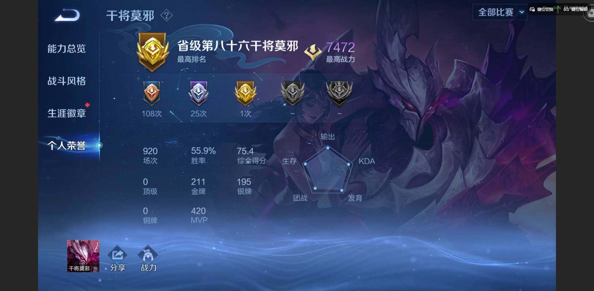 【金标干将莫邪】贵族等级: V10 英雄数: 129 皮肤数: 528 荣耀水