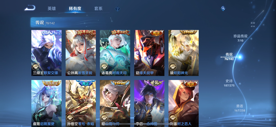 【荣耀V10 国服干将姜子牙532皮肤11典藏1珍品无双4无双76传说7星元7
