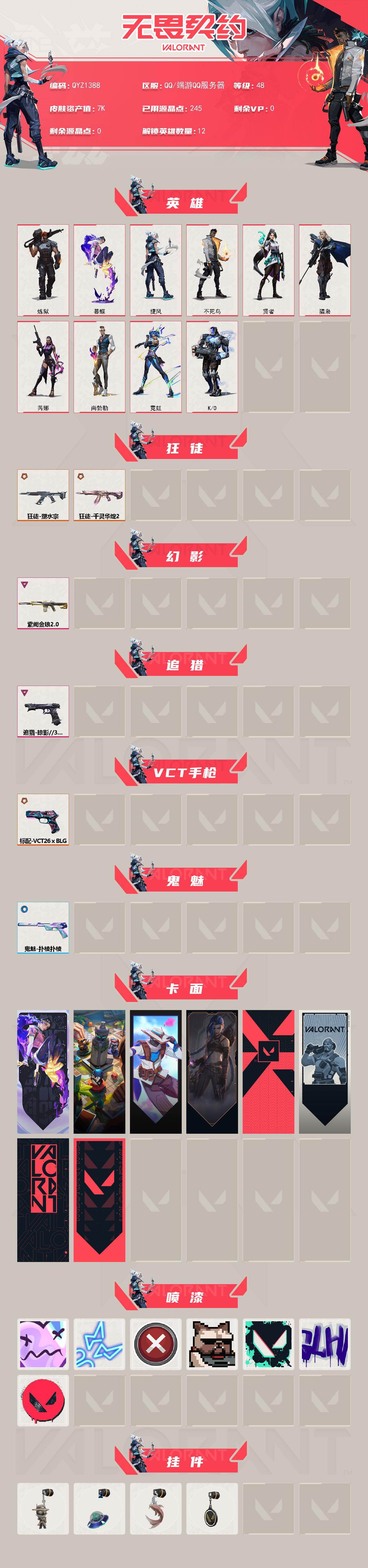 【QYZ1388】终极*4/卓越*2/皮肤*18/等级*48/段位:白银/炼狱/暮蝶/捷风/不死鸟/贤者/猎枭/芮娜/尚勃勒/霓虹/K/O/狂徒-塑水宗/狂徒-千灵华绽//2.0/幻影-紫阙金琅//2.0/追猎-掠影//3.0/标配-VCT26 x BLG/鬼魅-扑棱扑棱/无畏契约:暮蝶 卡面/战术桌游 卡面/无畏契约GO!第一卷:零 卡面/《双城之战》金克丝 卡面/代号红色 卡面/新兵报到 卡