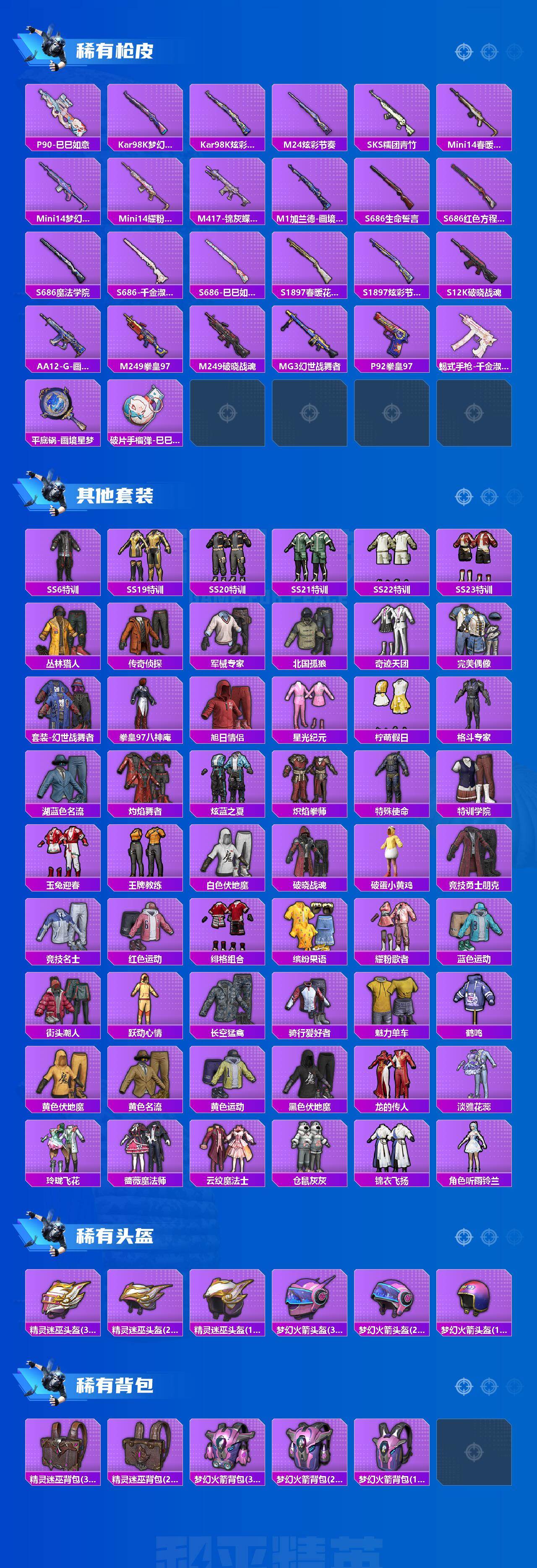 【粉色枪皮等级】:GROZA-镜光银凌(五级),UMP45-萌骑冒险(三级),Kar98K-巳巳如意(五级),Mk14-樱桃泡泡(七级),Mk14-福马献瑞(五级),DP-28-千金淑猫(五级),DP-28-豹影疾电(五级)