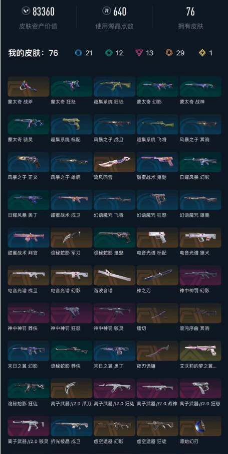 【WWC1912】终极*29/传奇*1/卓越*13/皮肤*76/等级*74/段位:白银/电音光谱套装/噬影者套装/虚空遗器套装/VCT 2025 赛季套装/神中神罚套装/离子武器//2.0套装/幻棱/炼狱/维斯/暮蝶/壹决/捷风/雷兹/幽影/不死鸟/贤者/猎枭/芮娜/奇乐/尚勃勒/霓虹/斯凯/夜露/K/O/海神/盖可/黑梦/钢锁/近战武器-流风回雪/近战武器-谐波音谱/近战武器-神之刃/近战武器