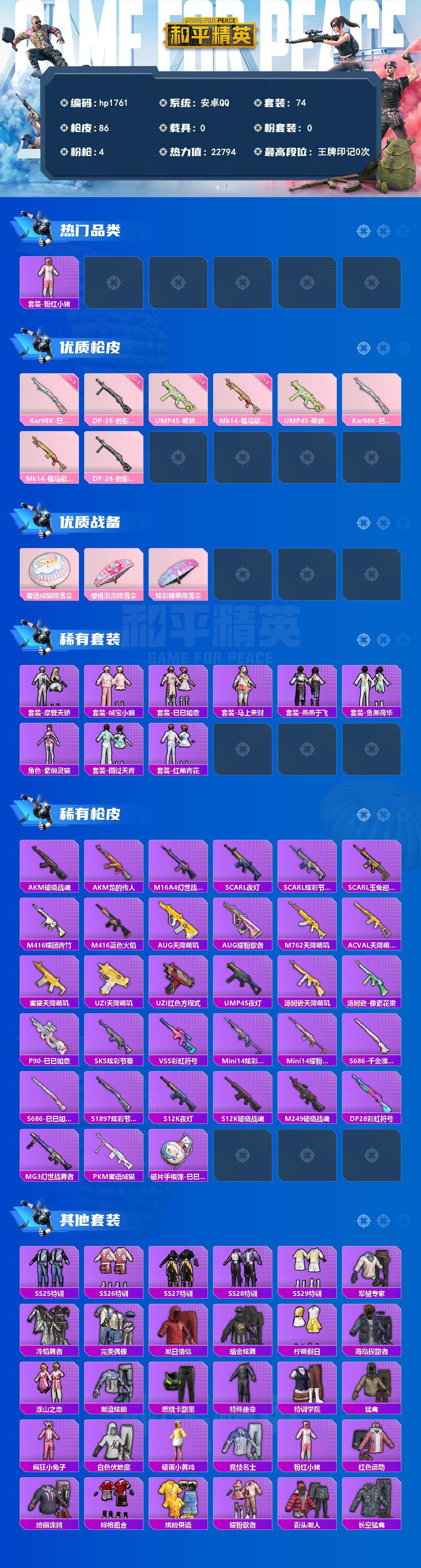 安卓 手Q-0粉装-4特效枪-0载具-0粉色飞行器-22794热力值-1王牌印记-74套装-86枪皮