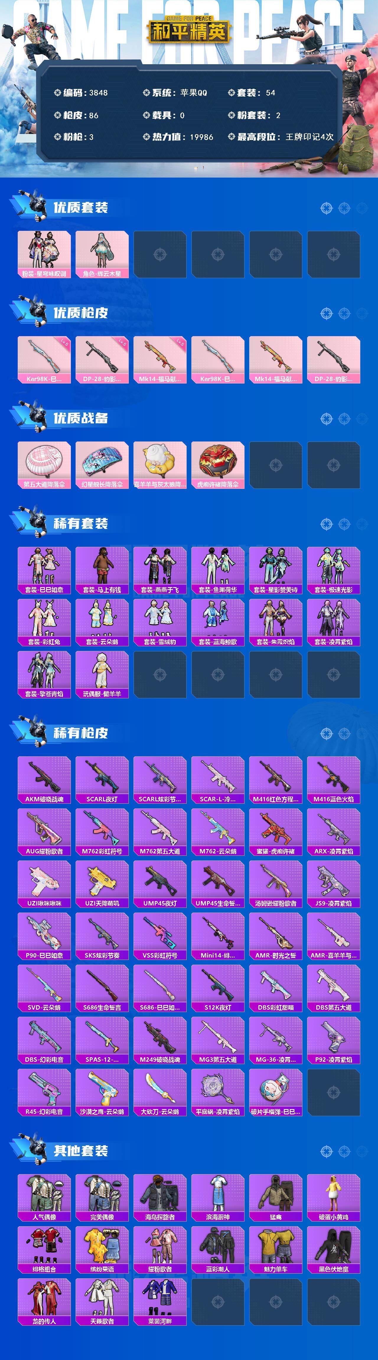 苹果 手Q-2粉装-3特效枪-0载具-0粉色飞行器-19986热力值-4王牌印记-54套装-86枪皮