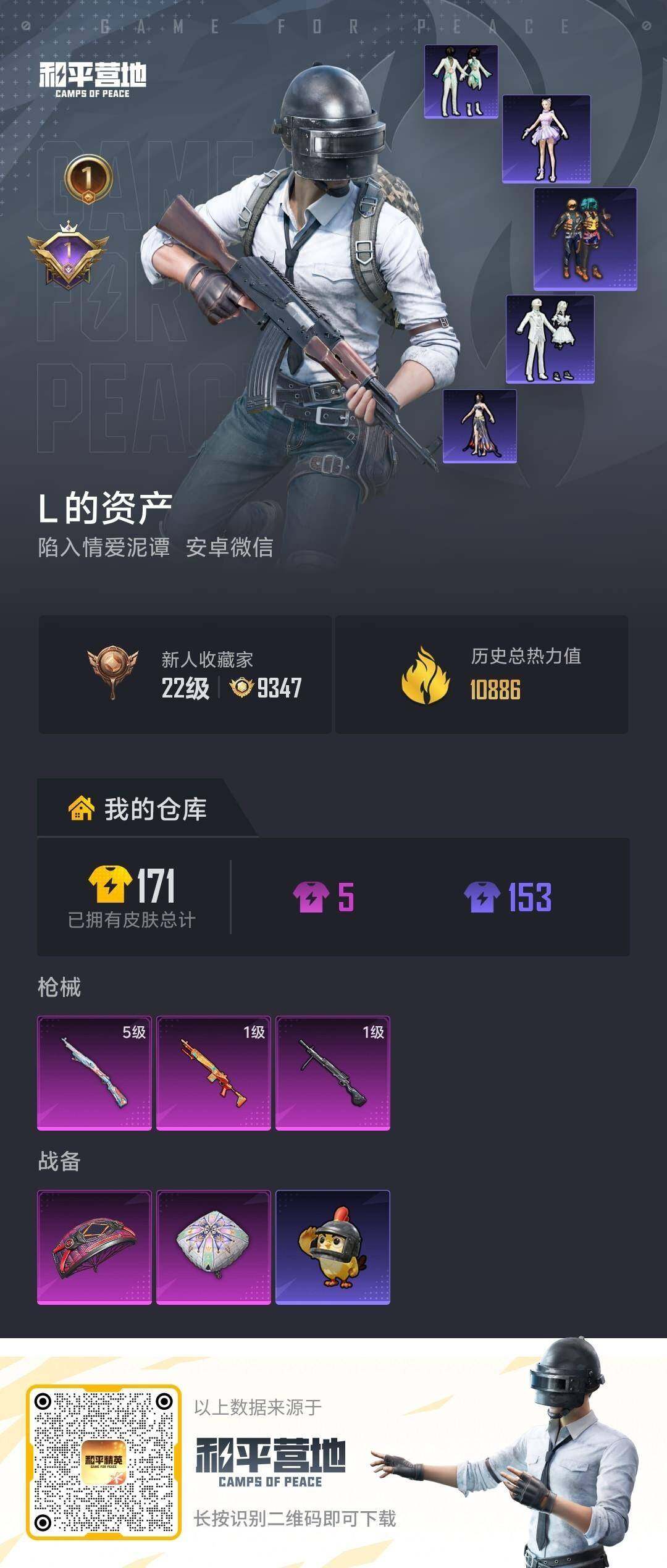 安卓 微信-0粉装-3特效枪-0载具-0粉色飞行器-10886热力值-1王牌印记-35套装-47枪皮